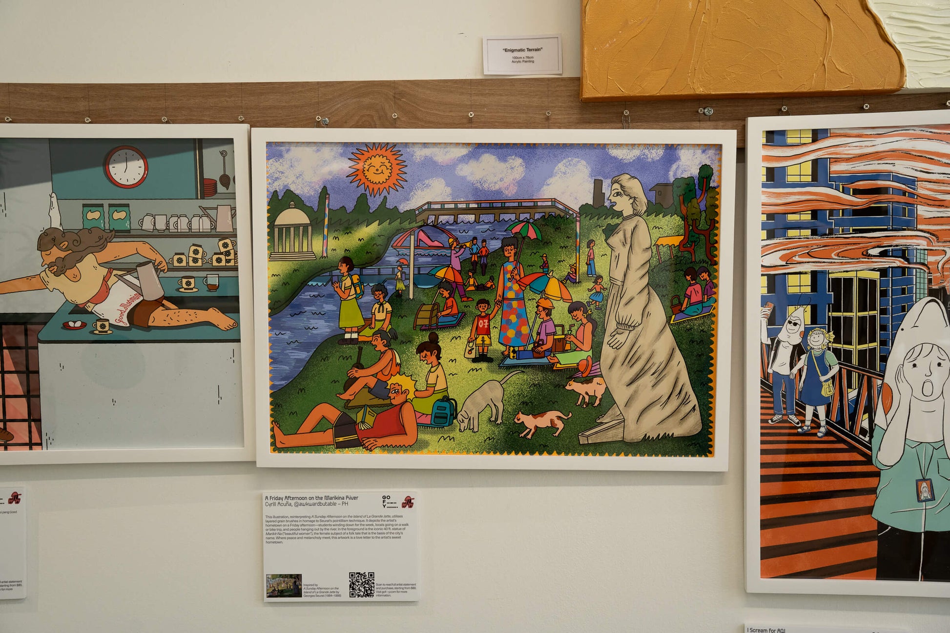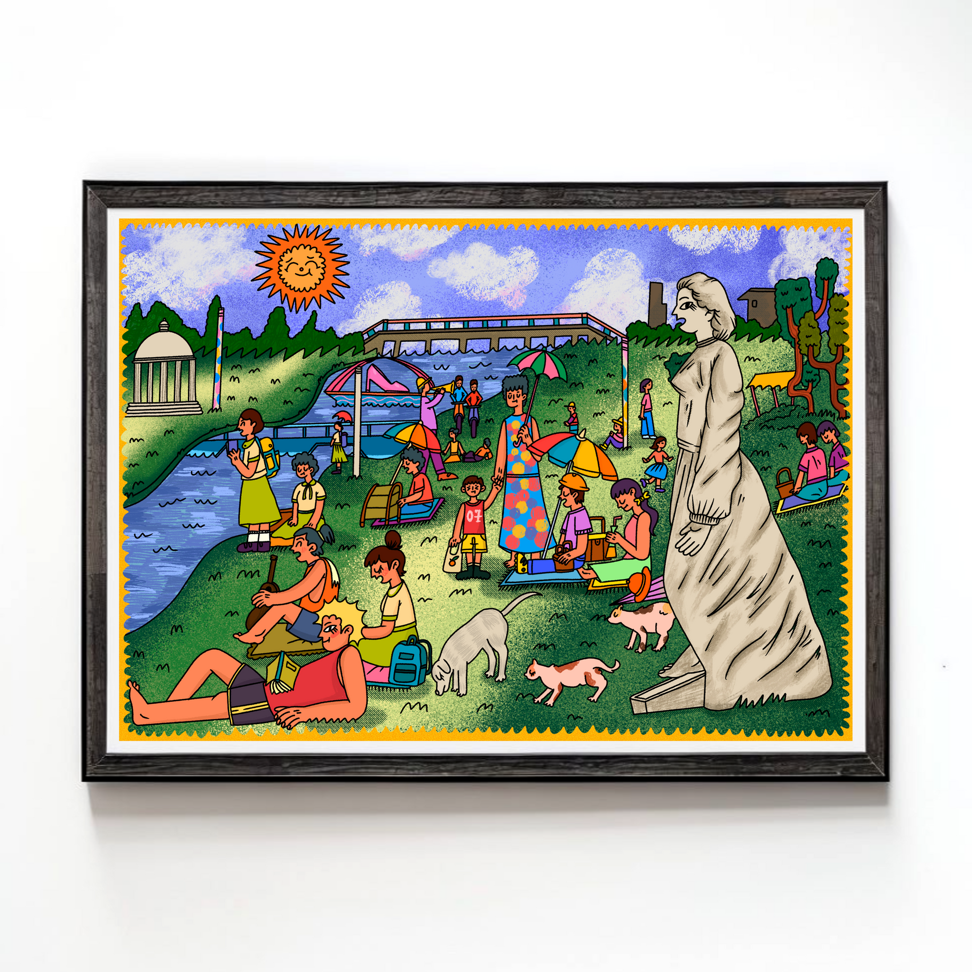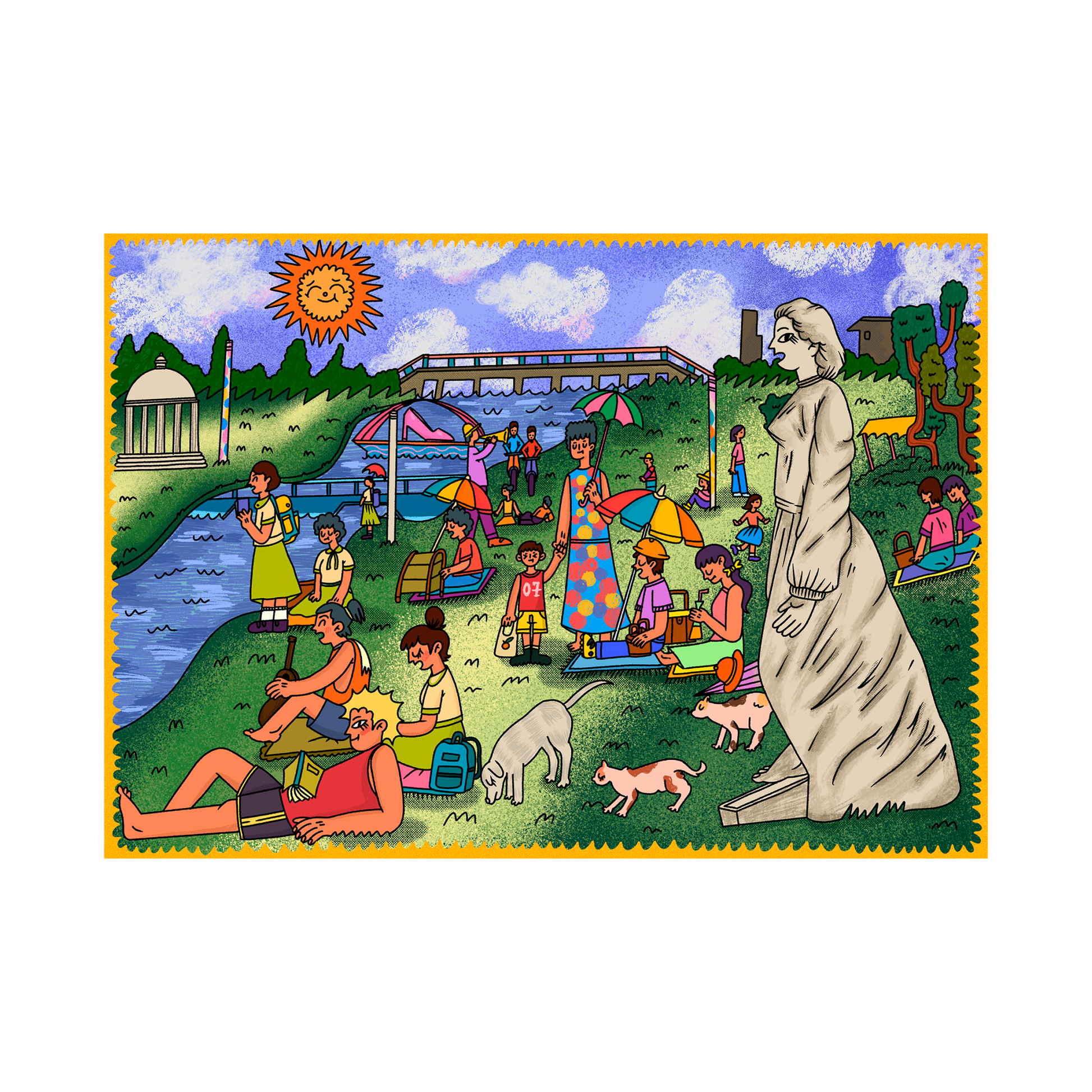 This illustration, reinterpreting A Sunday Afternoon on the Island of La Grande Jatte, utilises layered grain brushes in homage to Seurat's pointillism technique. It depicts the artist's hometown on a Friday afternoon—students winding down for the week, locals going on a walk or bike trip, and people hanging out by the river. In the foreground is the iconic 40 ft. statue of Marikit-Na ("beautiful woman"), the female subject of a folk tale that is the basis of the city’s name. Where peace and melancholy meet; this artwork is a love letter to the artist's sweet hometown.