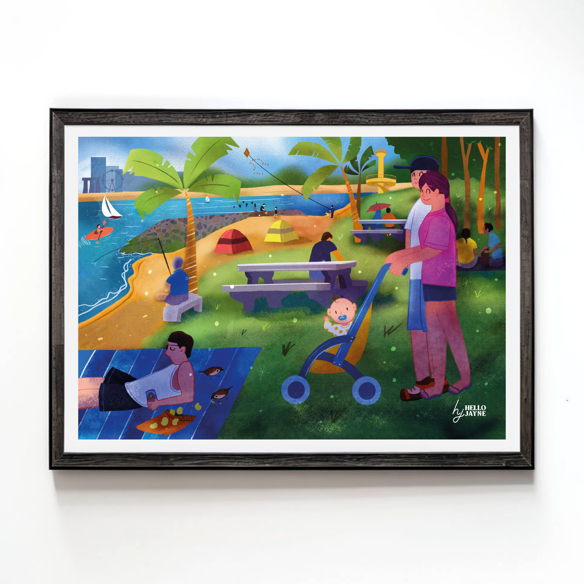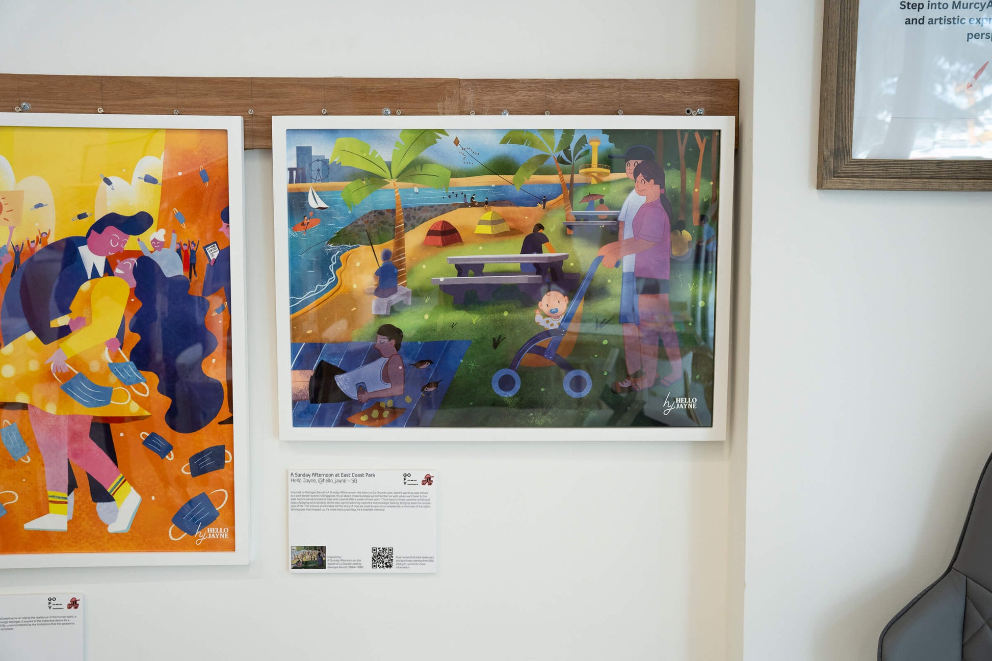 Inspired by Georges Seurat's A Sunday Afternoon on the Island of La Grande Jatte, Jayne's painting pays tribute to a well-known scene in Singapore. It's all about those Sundays we remember so well, when we'd head to the east coast's sandy shores to relax and unwind after a week of hard work. Think back to those carefree childhood days of playing and camping by the sea. Jayne's painting captures that nostalgic feeling, bringing back the simple joys of life. The colours and strokes tell the story of how we used to spend our weekends; a reminder of the idyllic landscapes that shaped us. It's more than a painting; it's a heartfelt memory.