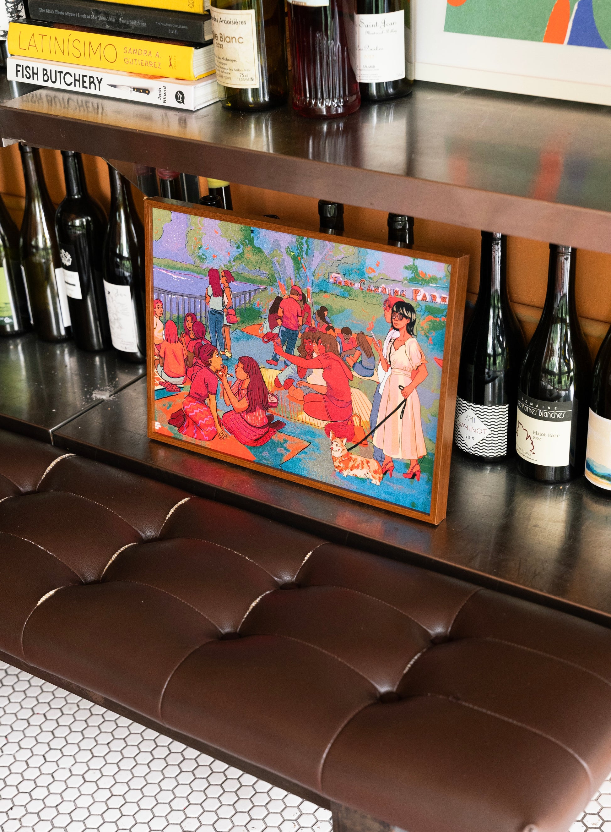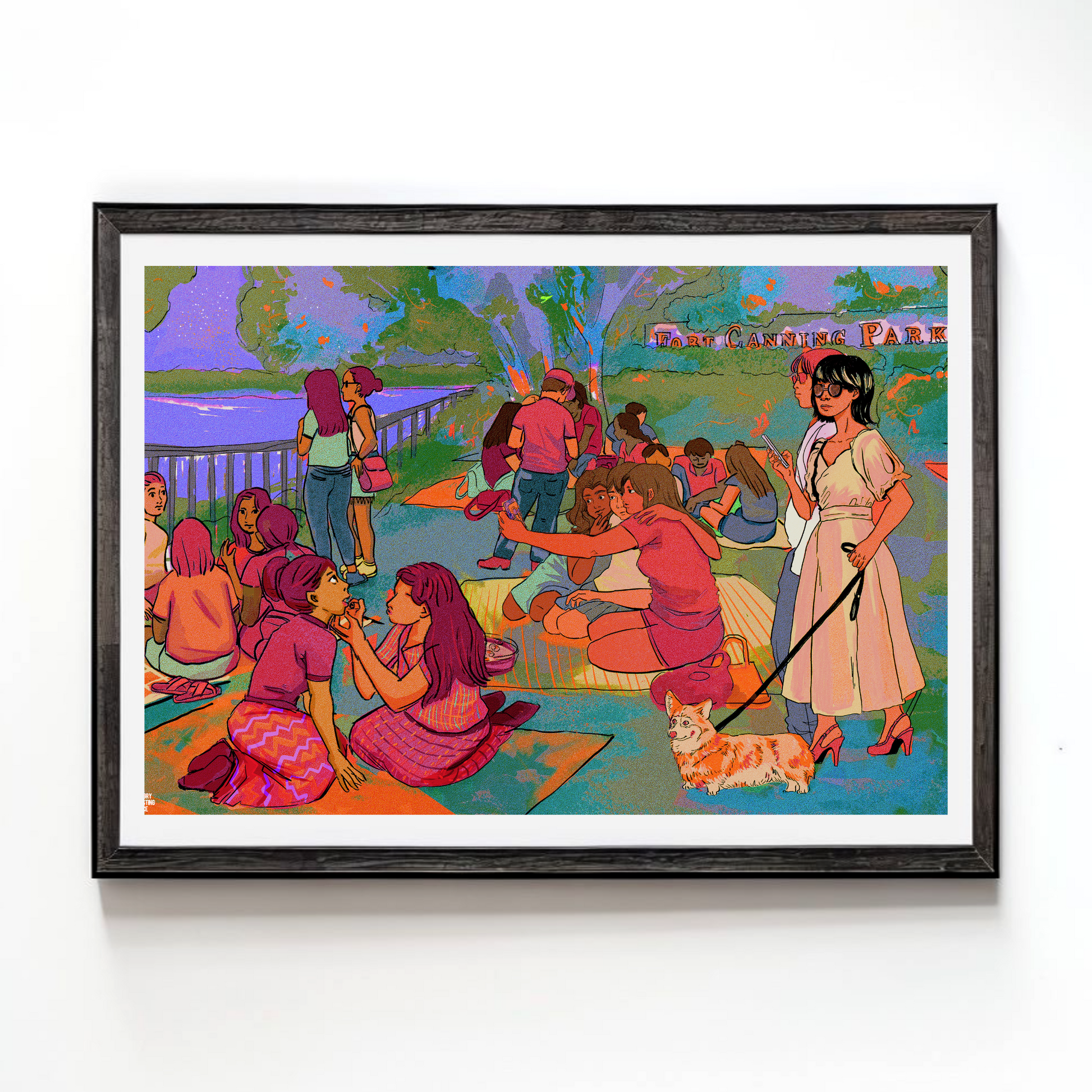 Taking inspiration from Georges Seurat's A Sunday Afternoon on the Island of La Grande Jatte, A Sunday Afternoon at Fort Canning Park reimagines the piece in Singapore's context. In 2019, 1 in 5 families employed a maid; this number increased after the pandemic. These domestic helpers would occasionally picnic at public green spaces on their off-days, decked in traditional outfits and sharing their hometown food. This piece aims to highlight the warm community these migrant workers have in Singapore, and how jovial they are on their off-day.