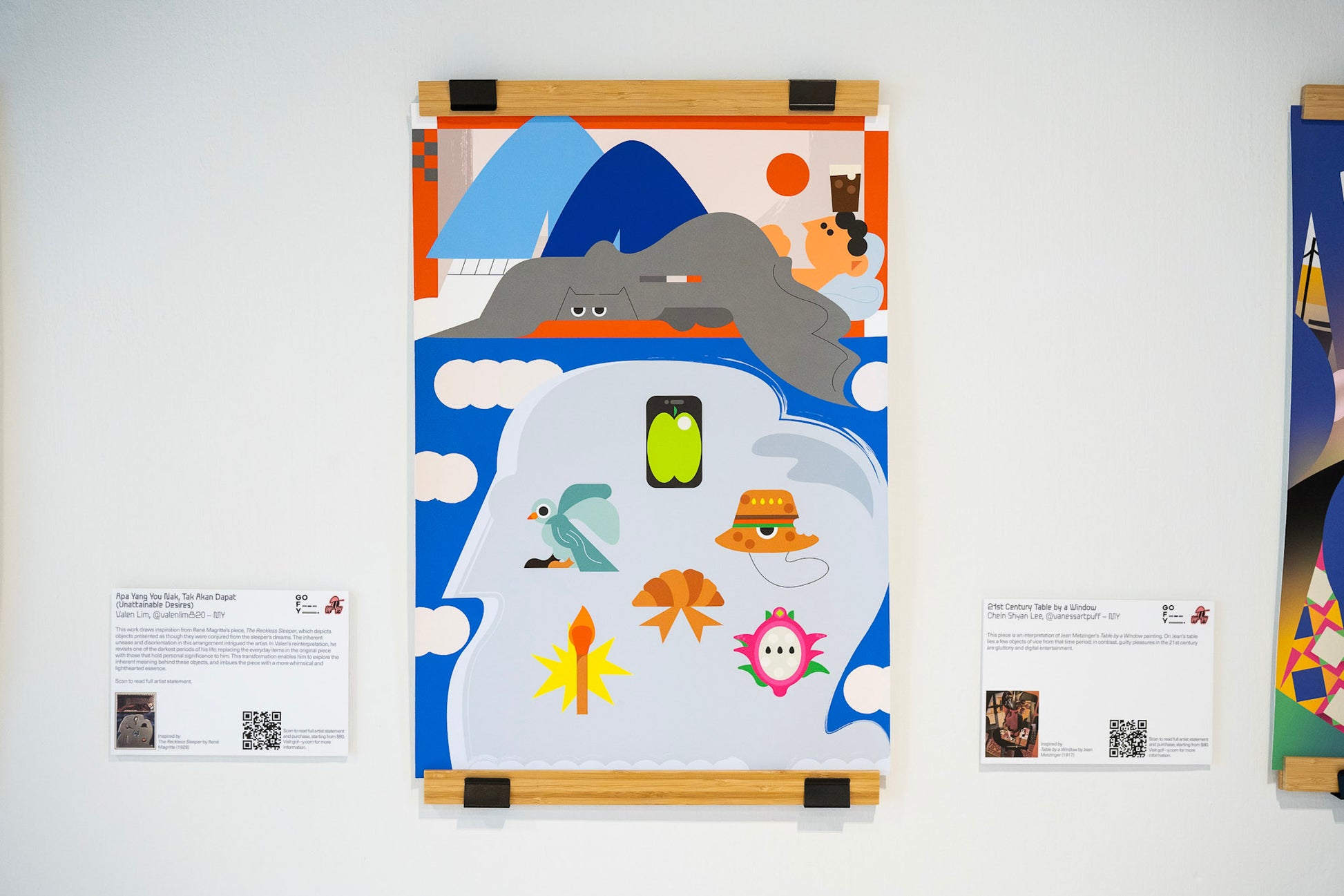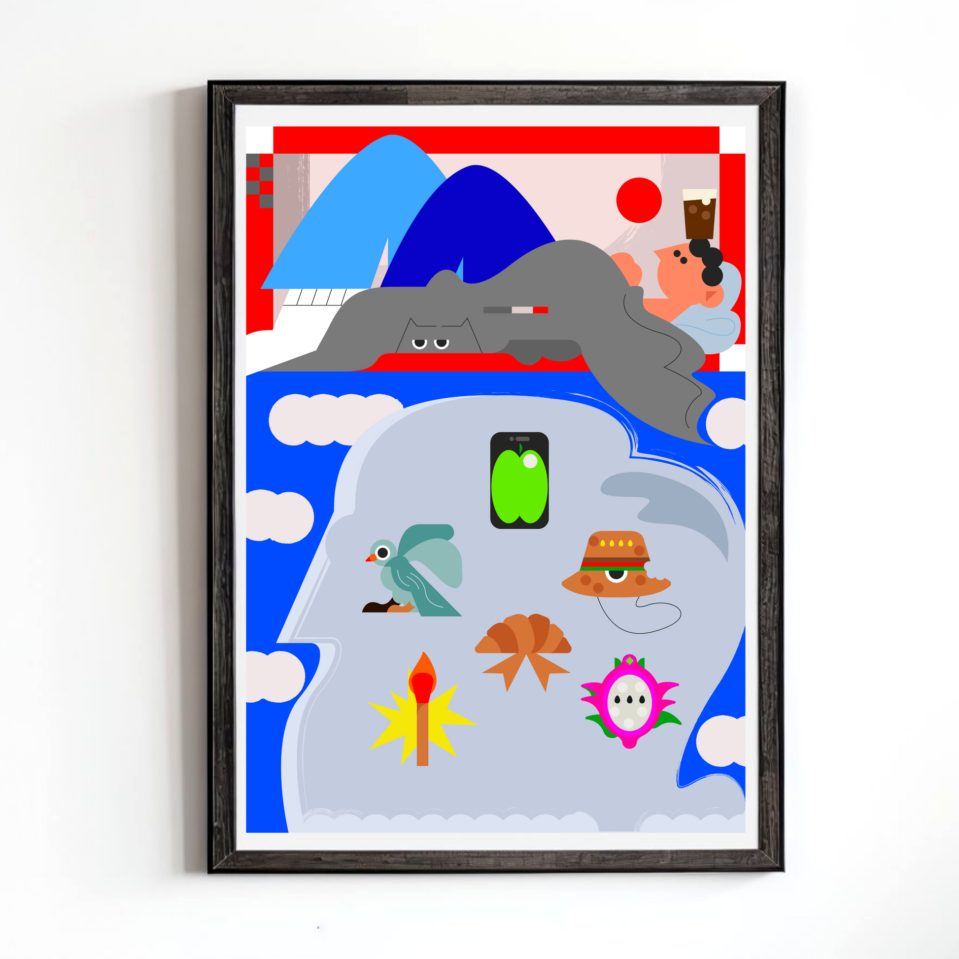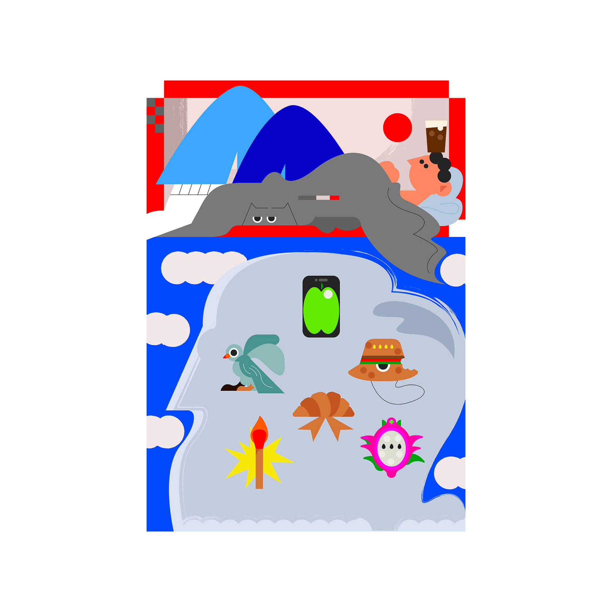 This work draws inspiration from René Magritte's piece, The Reckless Sleeper. Magritte's original work consists of two parts: one depicting a figure sleeping in a wooden alcove against a dark, cloudy sky backdrop, and another featuring everyday objects arranged in a manner reminiscent of a children's book. These objects are presented as though they were conjured from the sleeper's dreams. The inherent unease and disorientation in this arrangement intrigued the artist.