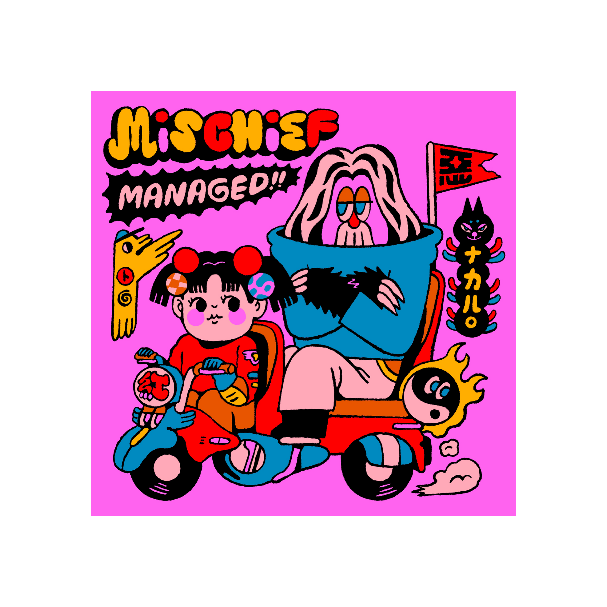 Inspired by Journey to the West, the artist portrays the Red Boy (Anghaiji, 紅孩兒) summoning dream demons to form a motorbike gang set to cause chaos. In Wu Cheng'en’s famous novel, the Red Boy is a mischievous demon who controls fire. Here, the Red Boy is depicted as androgynous, which may allude to their journey of transformation and redemption.