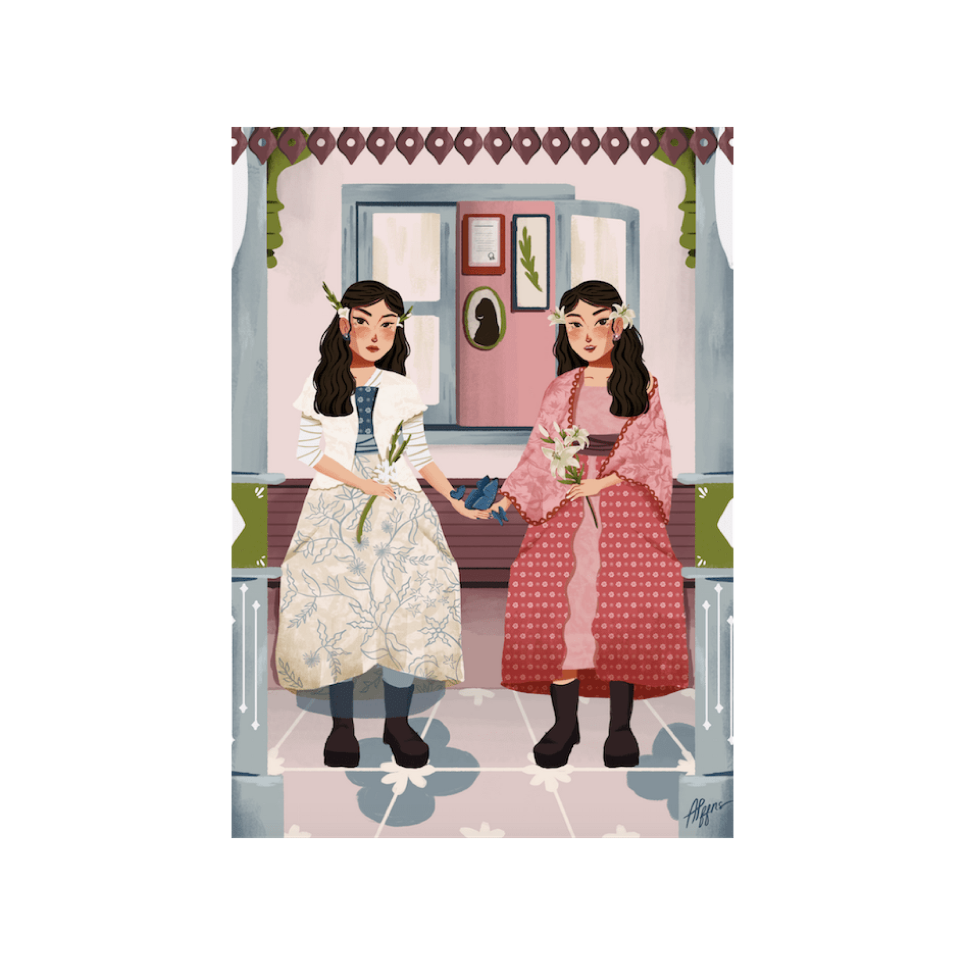 Empat Mata is an Indonesian colloquialism referring to a private conversation between two people. Inspired by Frida Kahlo's The Two Fridas, Aliffia's work is about a girl you might know, who has been hiding all her emotions behind the sweetest smile. She keeps the truth to herself because she knows people would simply judge. In essence, this is a portrait of internal conversations.