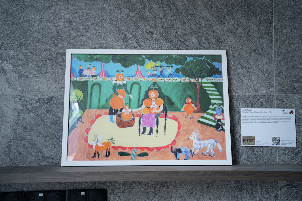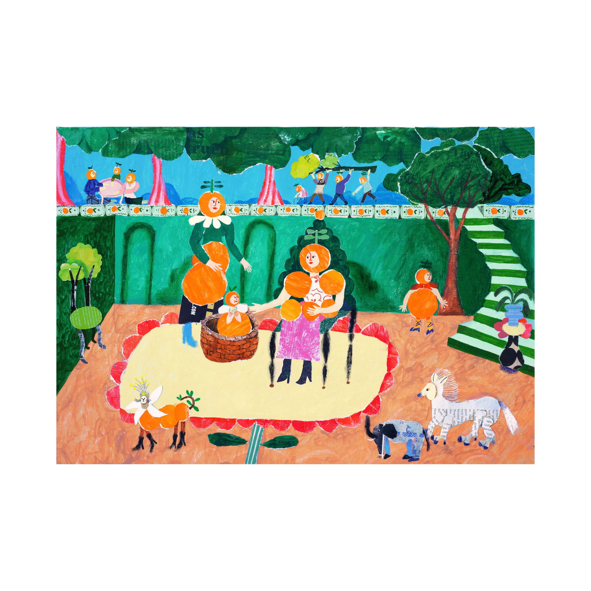 This piece is inspired by Neighbourly Advice by Leonora Carrington, and represents the artist's warm feelings towards traditional South East Asian family values. In her experience, there is a deep sense of home where parents and elders raise the children together, and a connection is shared between generations—creating bonds that survive all squabbles, with the warmth of sagely advice passed down through the lineage. One roof, one family.