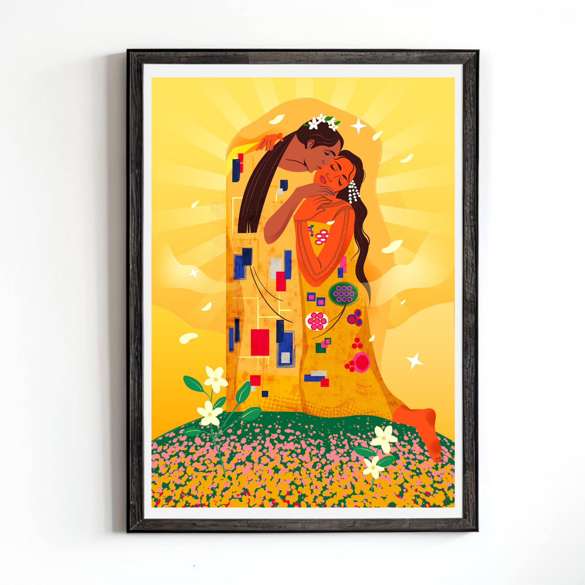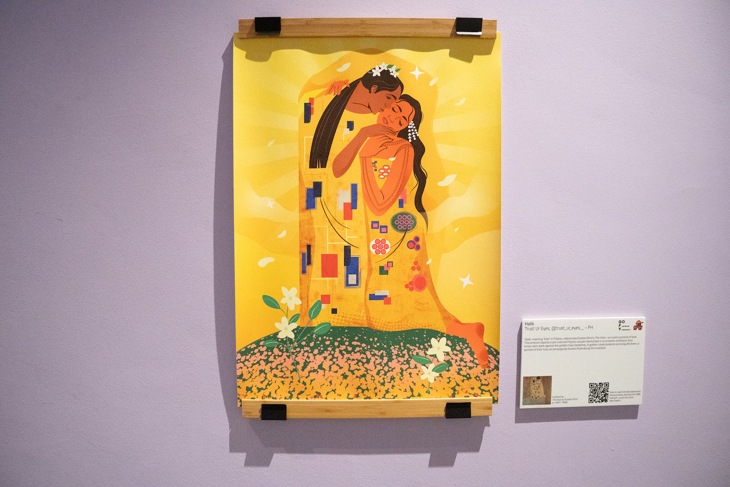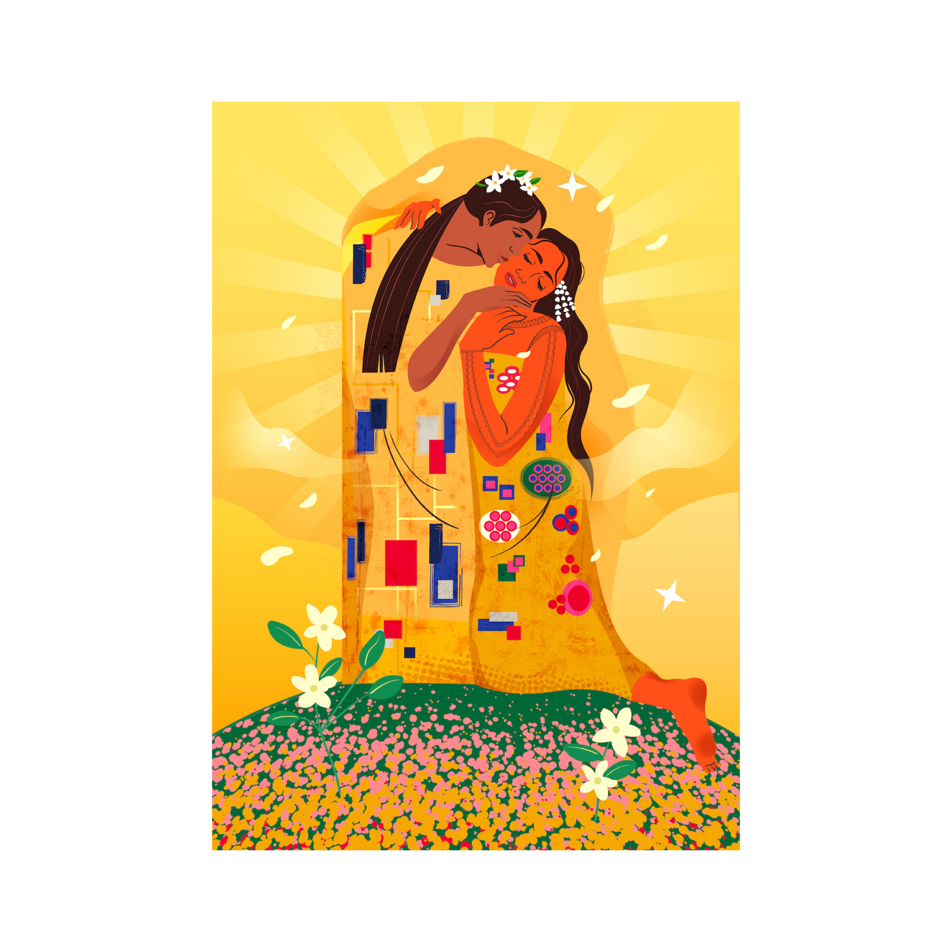 Halik, meaning "kiss" in Filipino, references Gustav Klimt's The Kiss—an iconic portrait of love. This artwork depicts a pre-colonial Filipino couple interlocked in a romantic embrace; their brown skin stark against the golden hazy backdrop. A golden cloak protects and engulfs them, a symbol of their love, as sampaguita flowers float along the meadow.