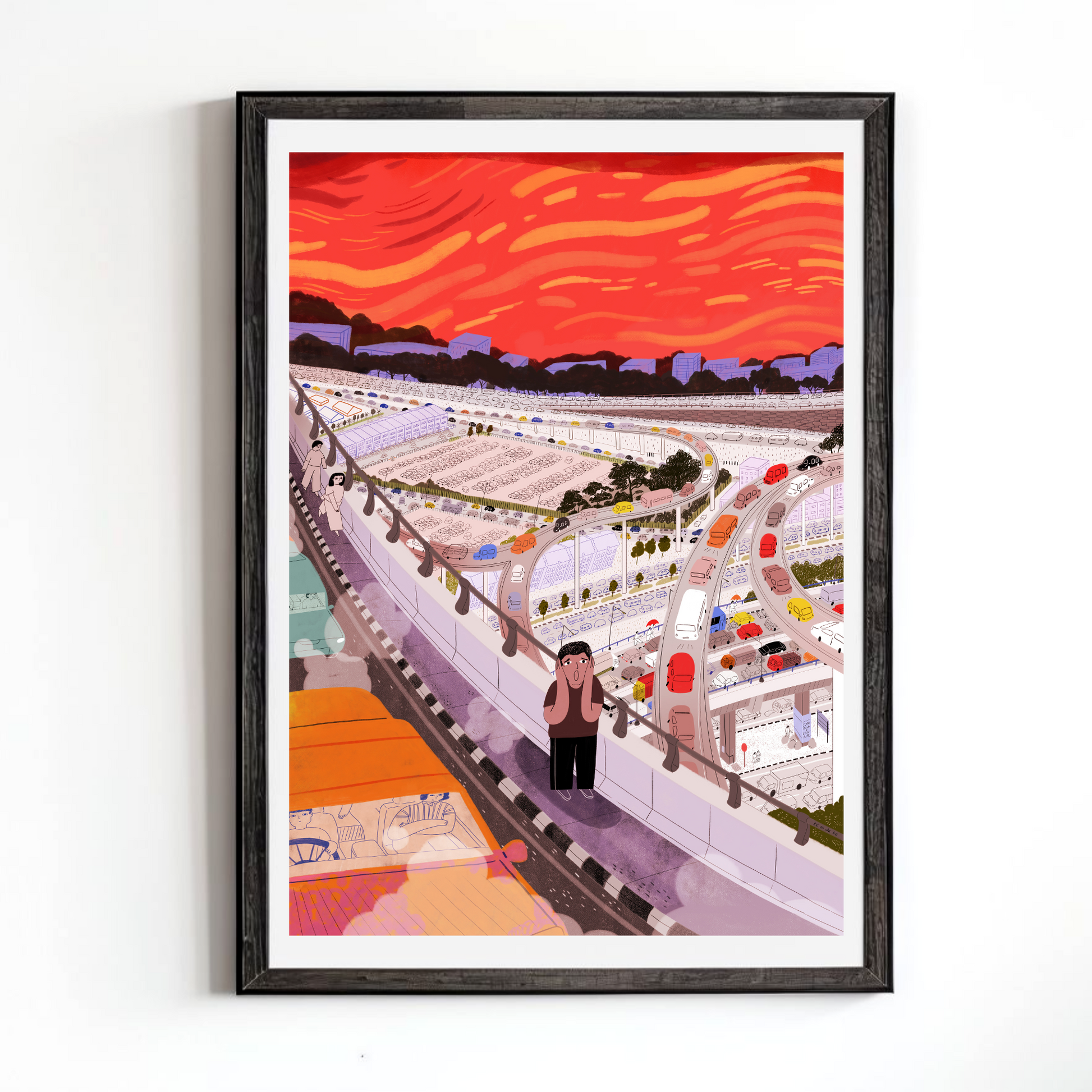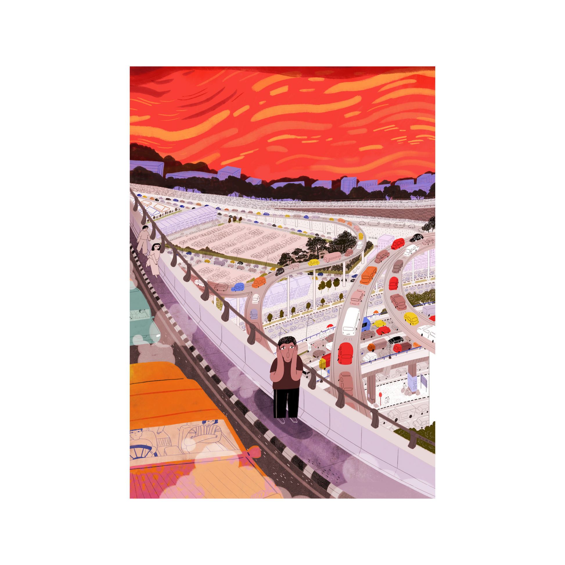 This piece references Edvard Munch's painting The Scream; the central figure's expression and background composition reminds the artist of the feeling she gets when she's trapped at a busy highway in Kuala Lumpur. The sheer traffic, noise, smell and heat overwhelms her body and soul, and it's a transitional space that most Malaysians have to experience on a daily basis. She questions why this is the reality we are living in.