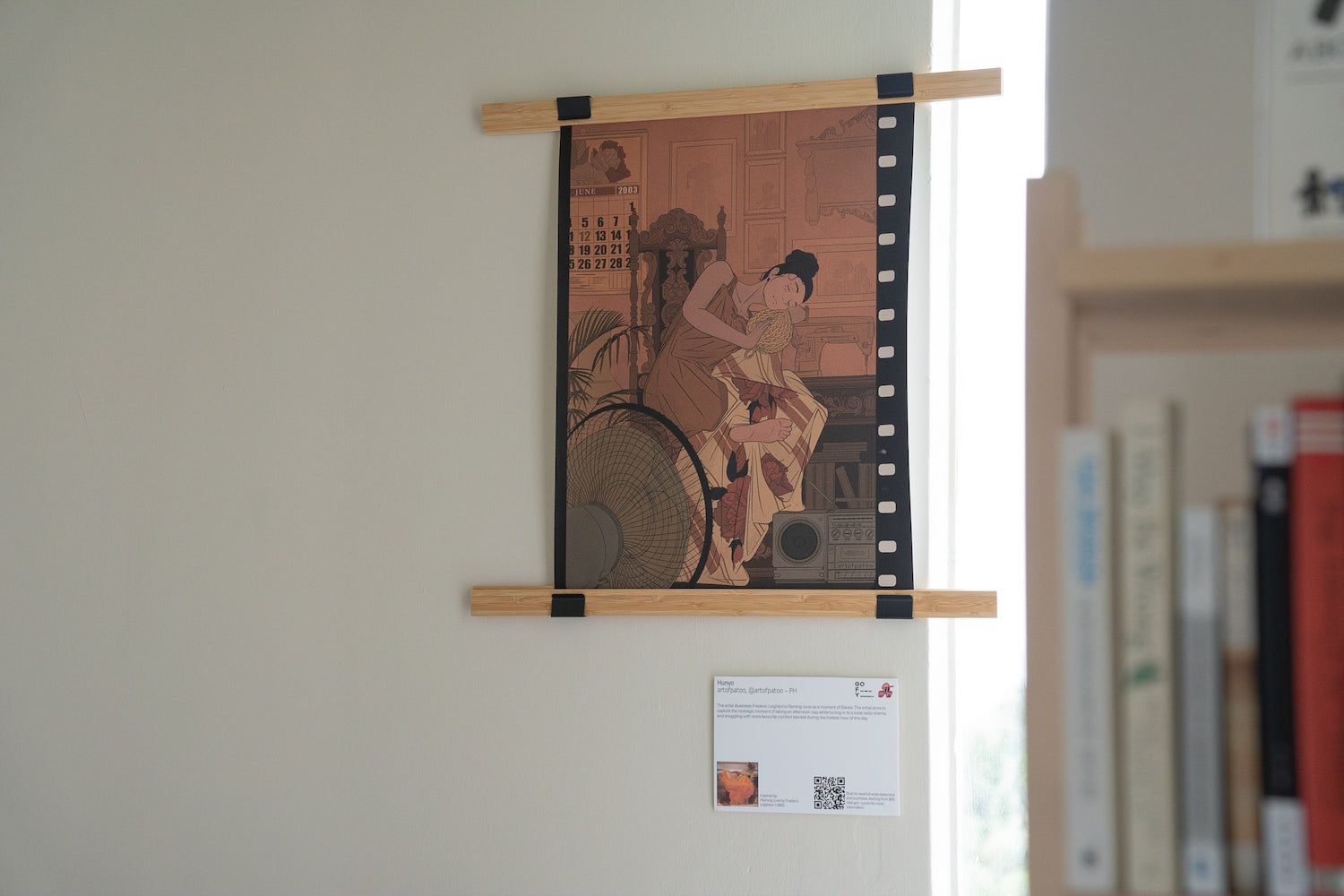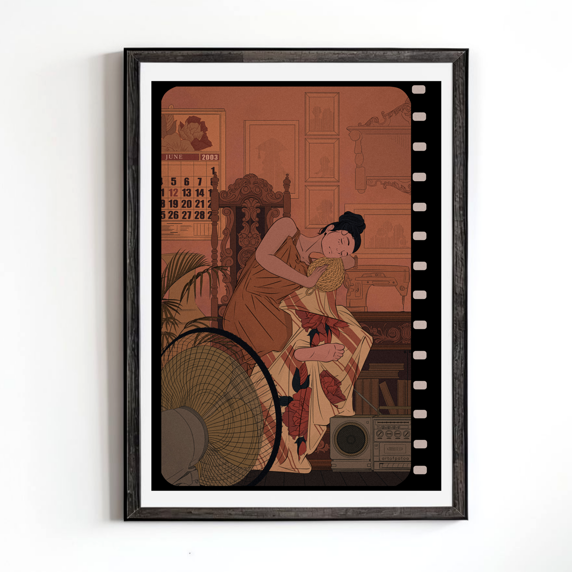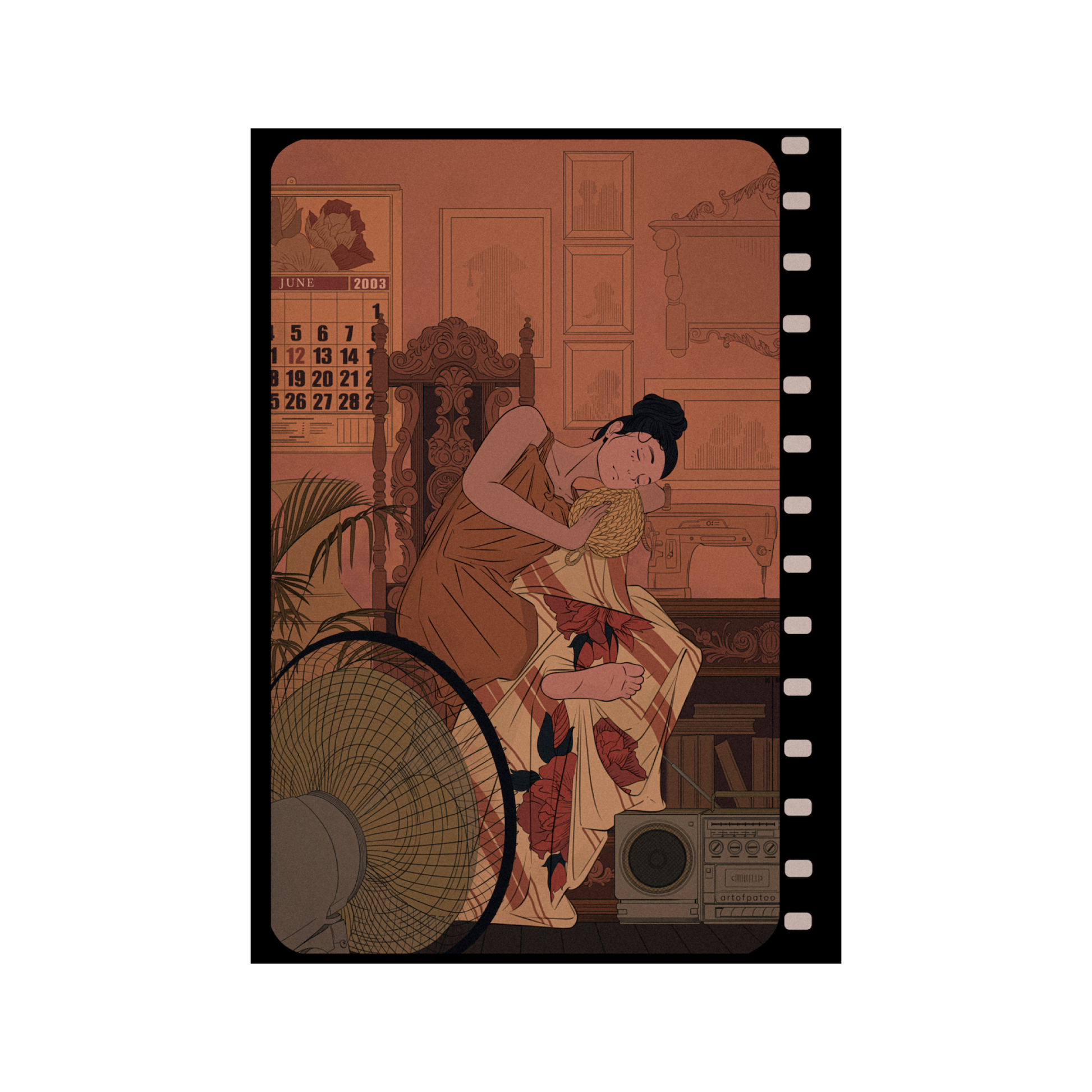 The artist illustrates Frederic Leighton's Flaming June as a moment of Siesta. The artist aims to capture the nostalgic moment of taking an afternoon nap while tuning in to a local radio drama, and snuggling with one's favourite comfort blanket during the hottest hour of the day.