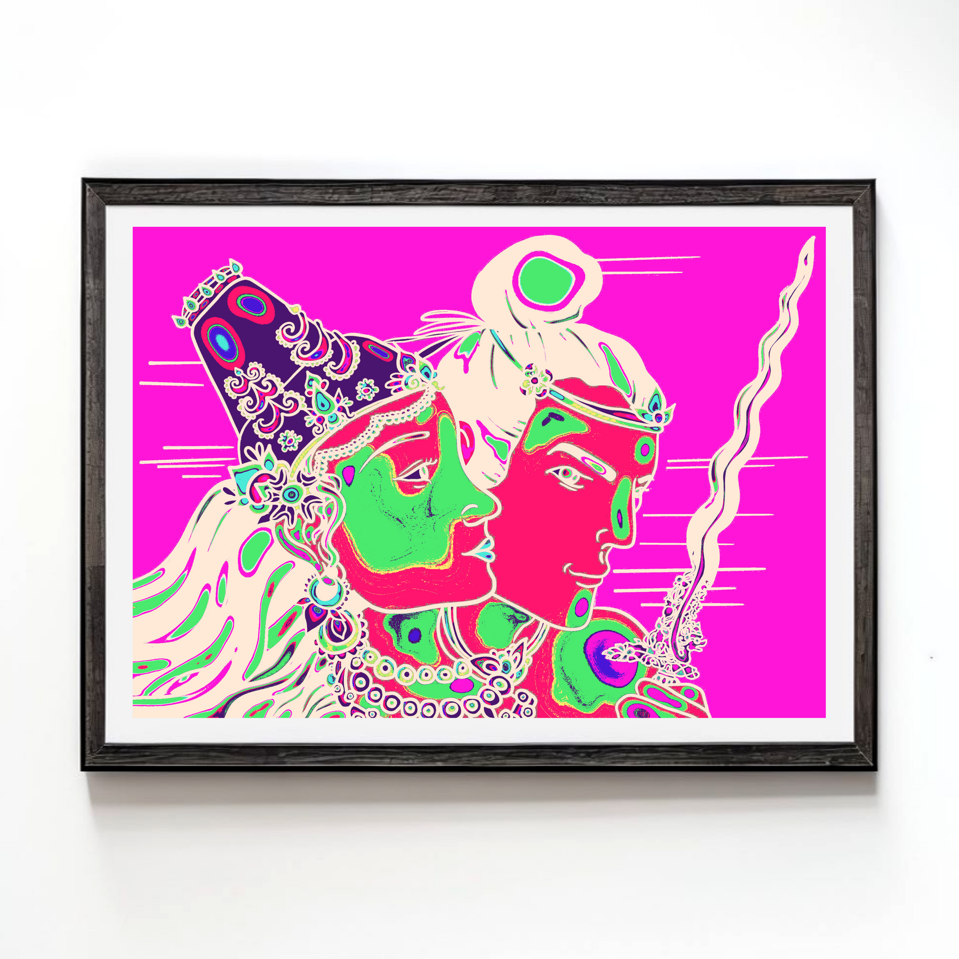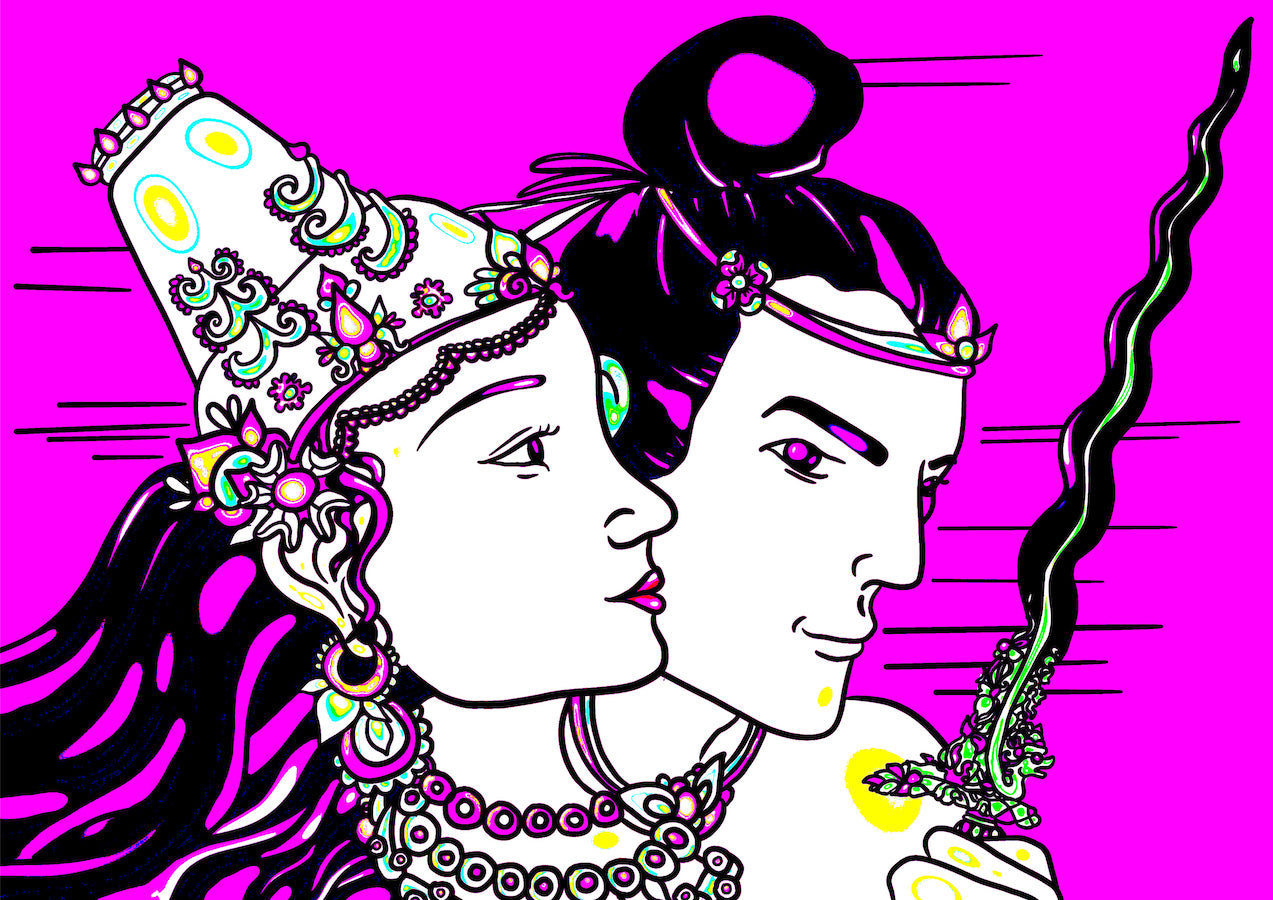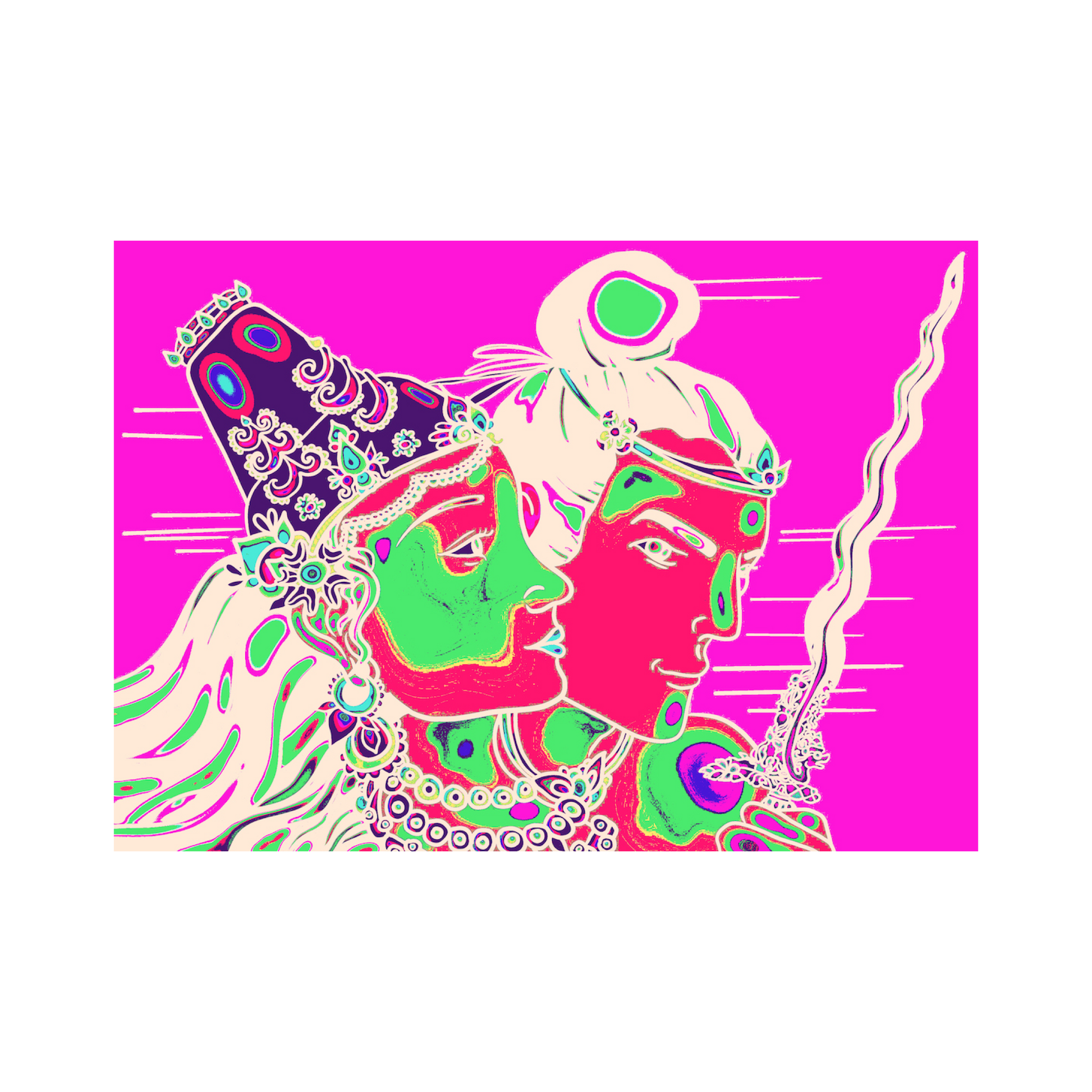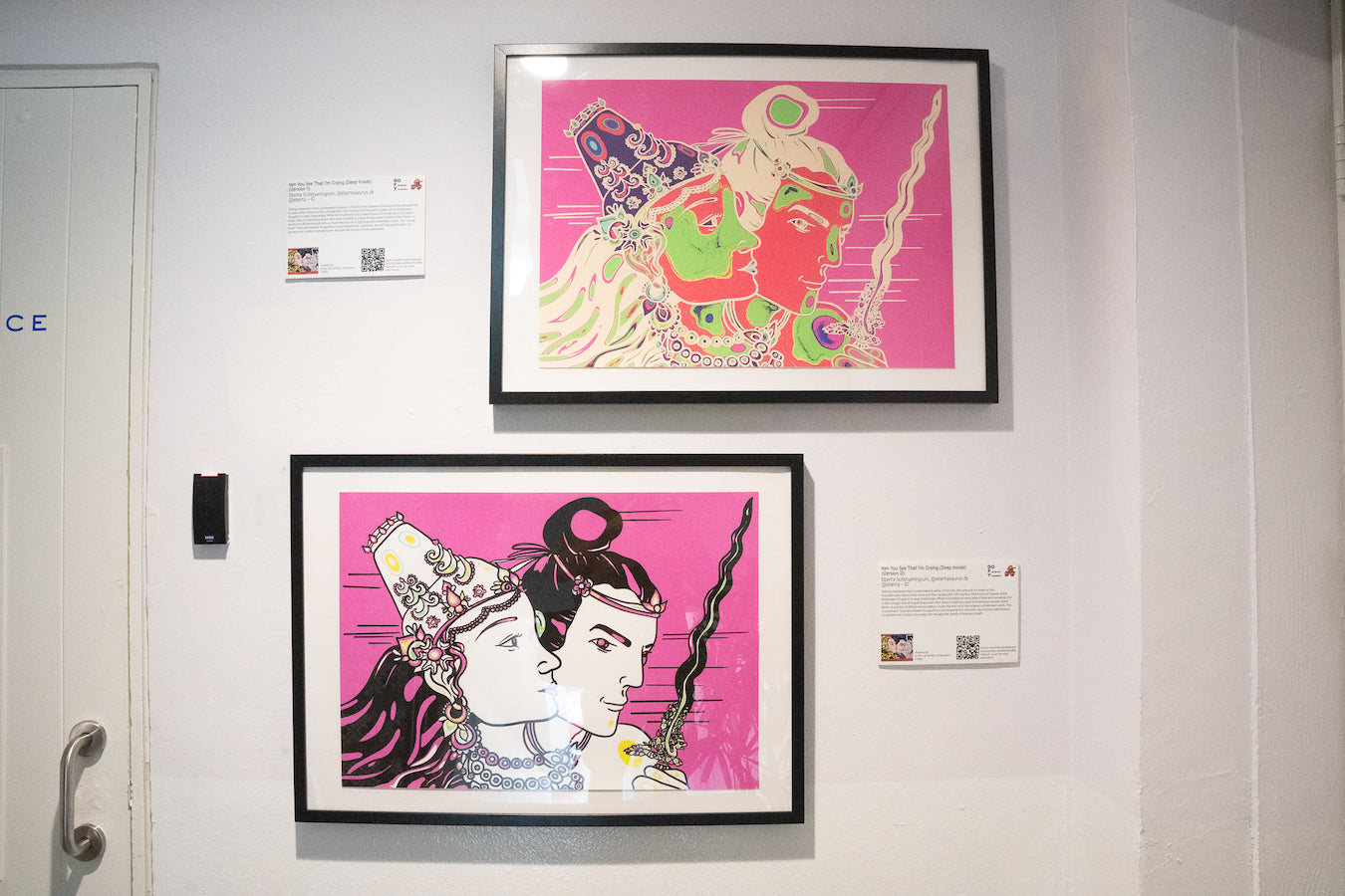 Taking inspiration from Lichtenstein's piece In the Car, this artwork is a twist on the melodramatic tales of Ken Arok and Ken Dedes (the 13th century first King and Queen of the Singhasari Kingdom in Java, Indonesia). While the traditional story tells of love and romance, it is in fact a tragic tale of impending doom. Ken Arok is holding a type of Indonesian sword called Keris—a symbol of affluence and status, much like the car in the original Lichtenstein work. The “movement” lines are present to signify a move towards the unknown, as nothing lasts forever; no ancient nor modern love story can escape the hands of time and death.