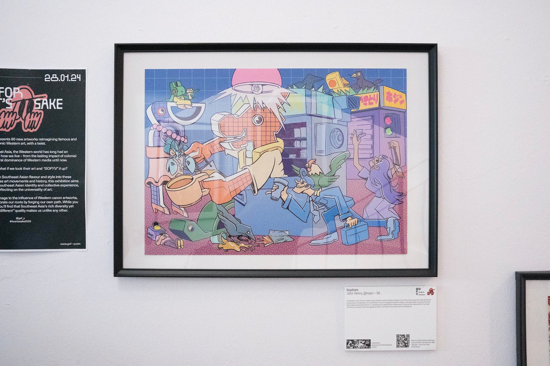 In Kopitiam, John Henry chose a busy hawker centre setting to depict one of the many frequent artist blocks he encounters. His depiction of a mishmash of iconic playground stone heads, corporate folks, and even the odd Kaiju (Japanese beast) thrown in, represents his experience of learning to channel the chaos within: his inner turmoil as a modern artist struggling to listen to himself more and find his confidence.