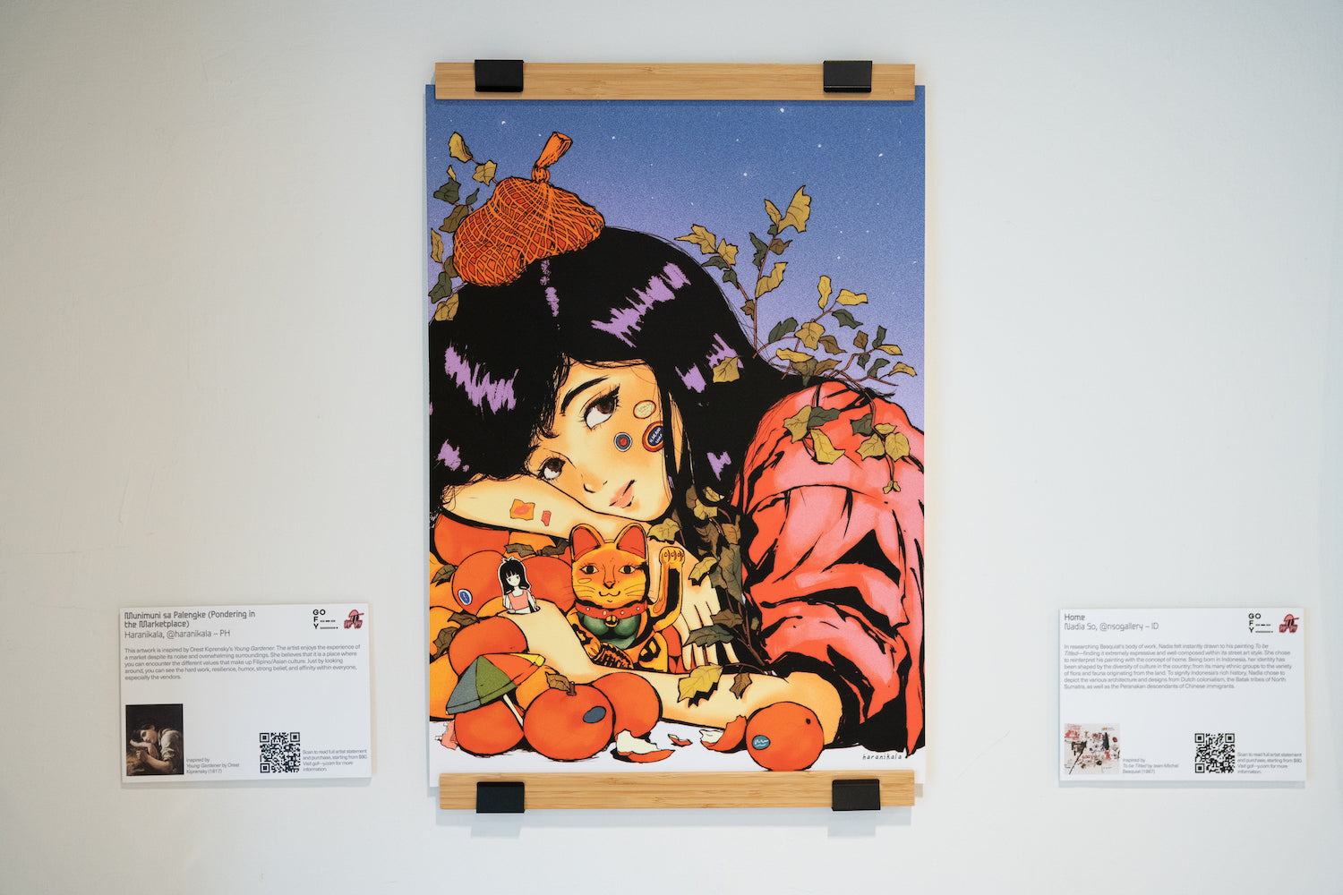 This artwork is inspired by Orest Kiprensky’s Young Gardener. The artist enjoys the experience of a market despite its noise and overwhelming surroundings. She believes that it is a place where you can encounter the different values that make up Filipino/Asian culture. Just by looking around, you can see the hard work, resilience, humor, strong belief, and affinity within everyone, especially the vendors.