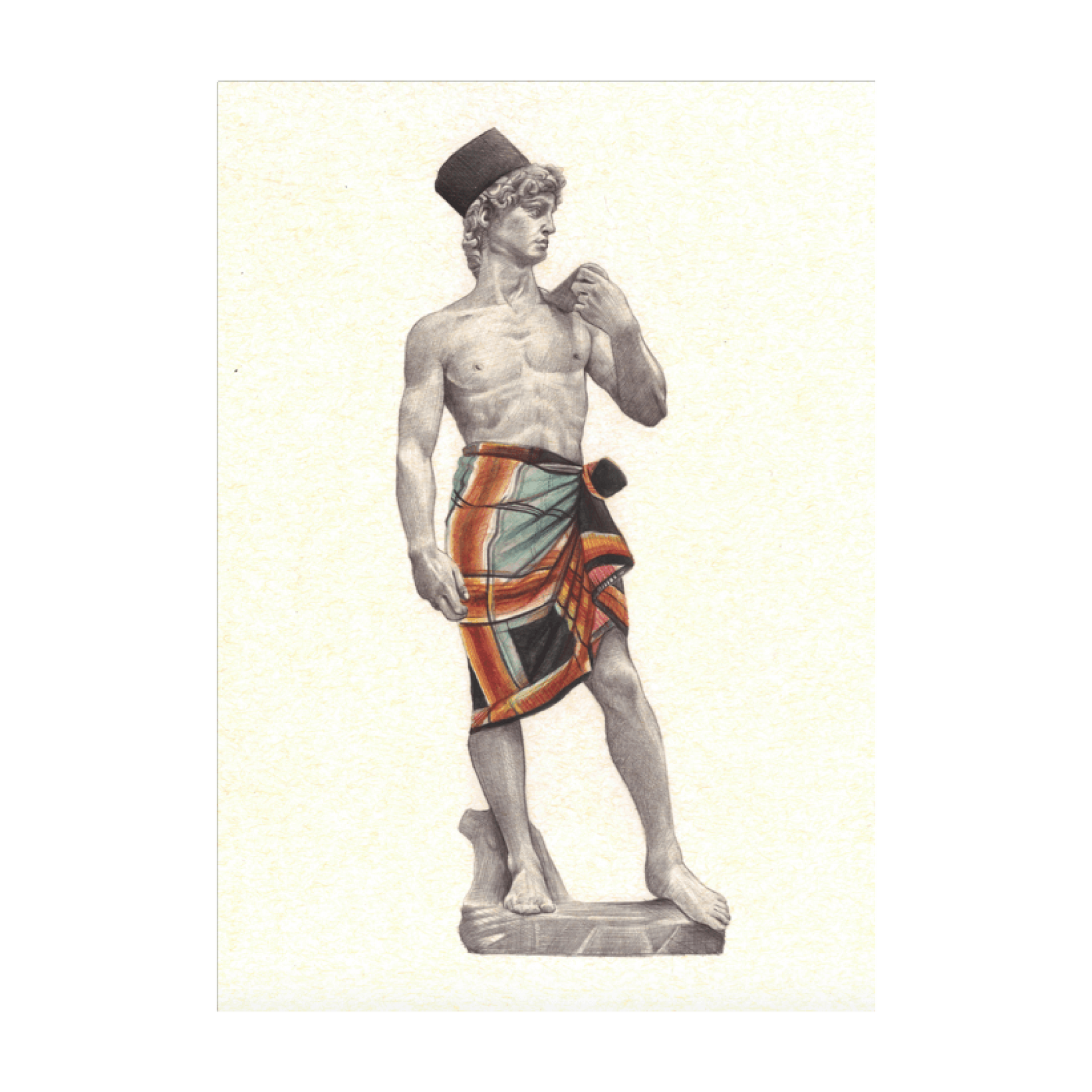 Yoss employs wordplay in titling Sa-Jarah. Formed by the words sejarah (history) and jarah (loot), this ballpoint-pen-and-watercolor artwork is a commentary on colonisation. By referencing coloniser behaviour of pillaging conquered territories and using loot to erect monuments to themselves, the artist pokes fun at them by dressing up a Western canon icon in Malaysian clothes.
