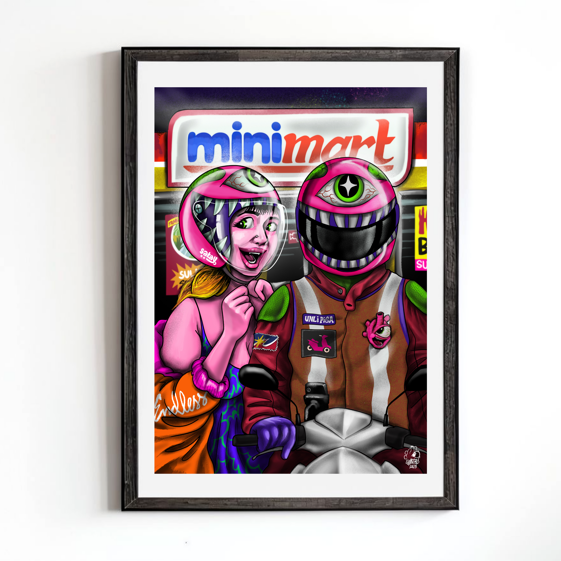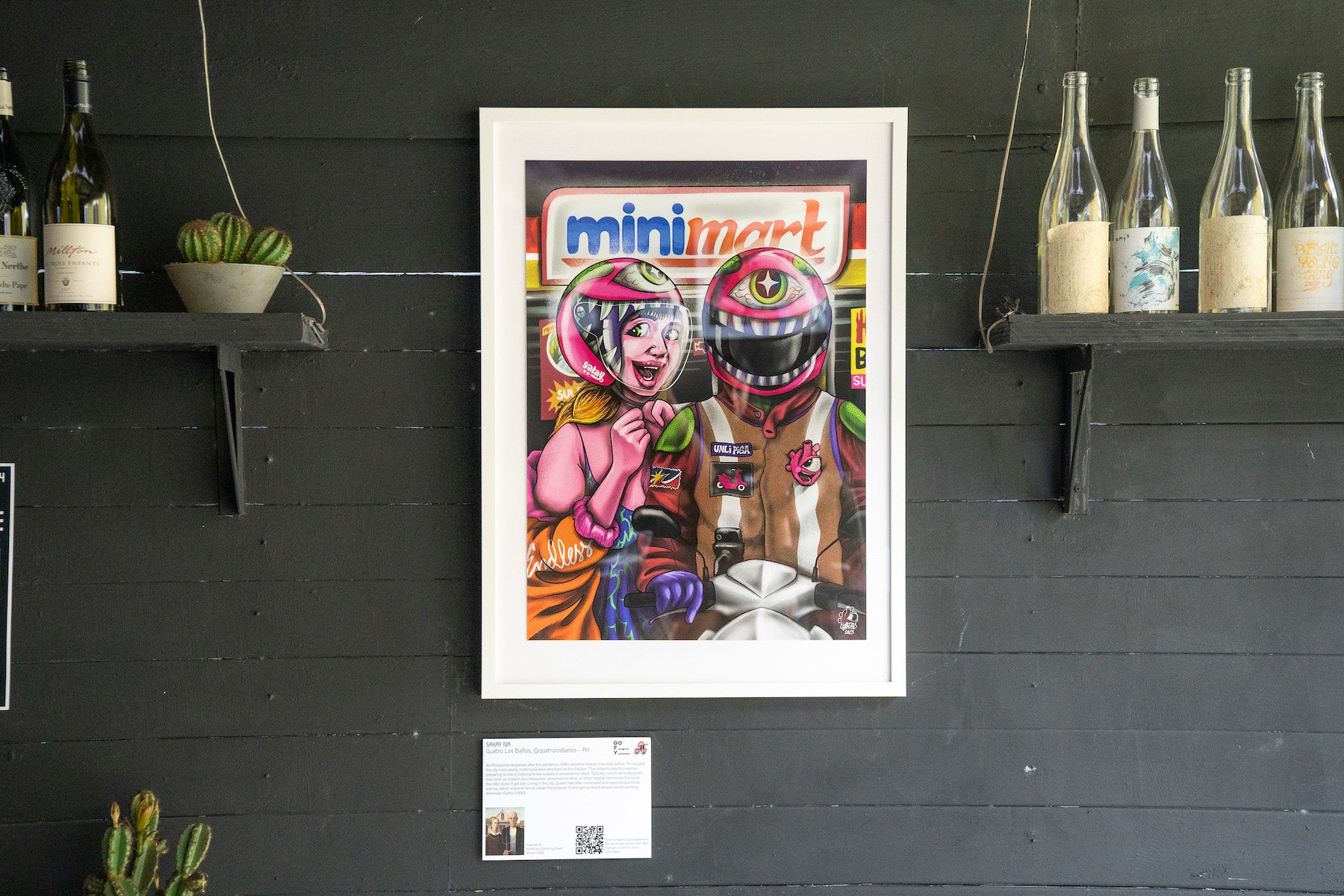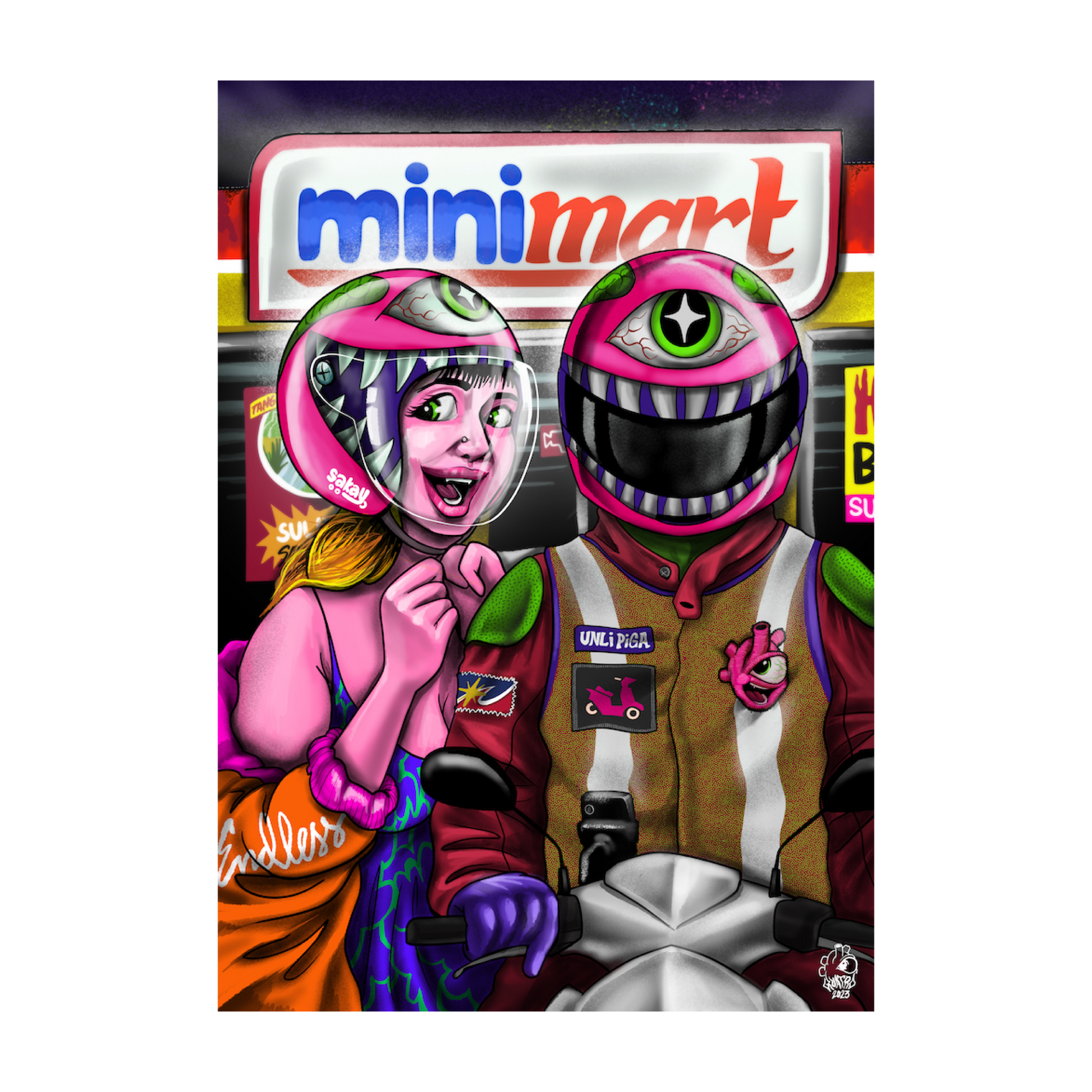 As Philippines reopened after the pandemic, traffic became heavier than ever before. To navigate the city more easily, motorcycle taxis emerged as the solution. This artwork depicts a woman preparing to ride a motorcycle taxi outside a convenience store. Typically, commuters designate their pick-up location at a restaurant, convenience store, or other notable landmarks to ensure the rider doesn't get lost. Living in the city, Quatro has often witnessed and experienced these scenes, which inspired him to create this artwork. It reimagines Grant Wood's iconic painting American Gothic (1930).