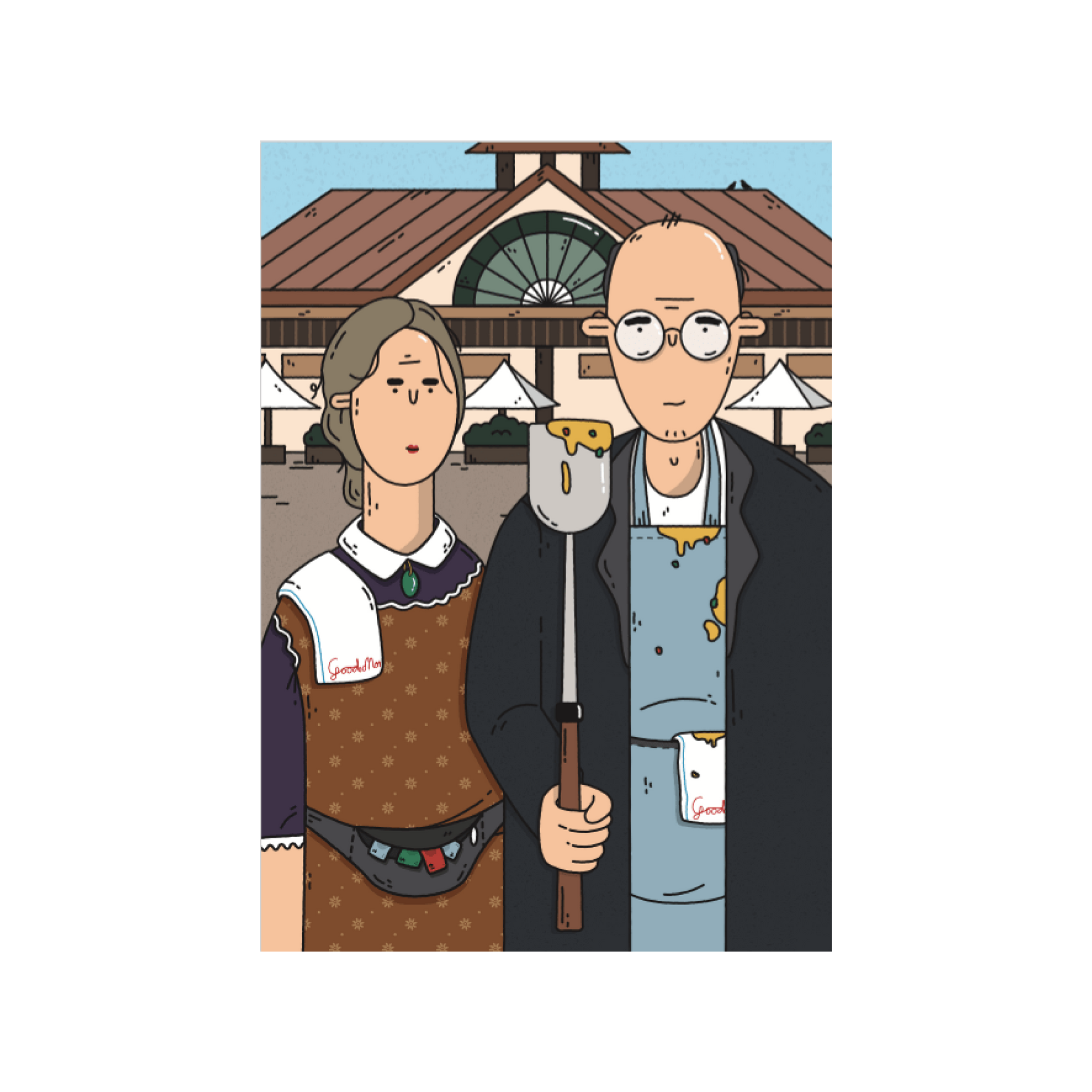 This artwork inspired by Grant Wood's American Gothic features the unsung heroes of Singapore against the backdrop of an iconic hawker centre – Lau Pa Sat – in honour of their hard work placed in satisfying our daily cravings.
