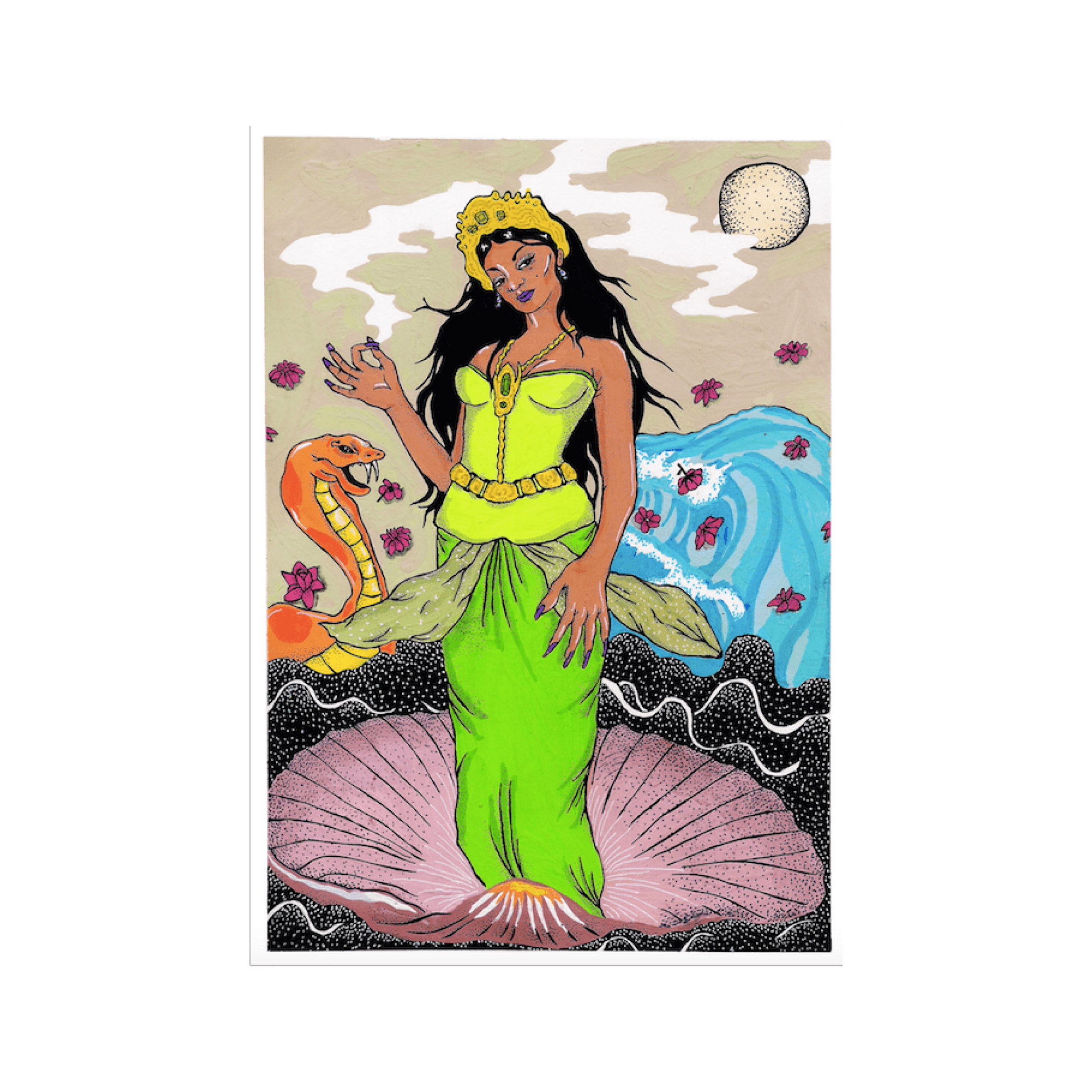 The Birth of Kanjeng Ratu is Ula's interpretation of Botticelli's The Birth of Venus. She draws parallels between Venus and Indonesian sea goddess Nyi Roro Kidul. While both figures are known for their beauty and aquatic abodes, Venus is commonly portrayed as being born from the sea, while Nyi Roro Kidul's life ends in the sea.