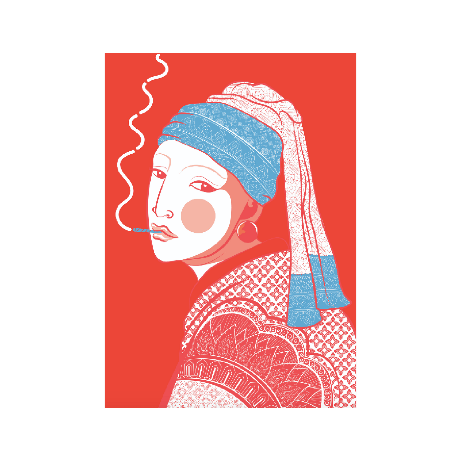 The highland indigenous peoples of Thailand are the minority of Thai ethnic groups, with vibrant and unique clothing that make them stand out from their natural surroundings. This illustration features a highlander woman covered from head to shoulder with traditional embroidery fabric, warming her lip with a lit cigarette.