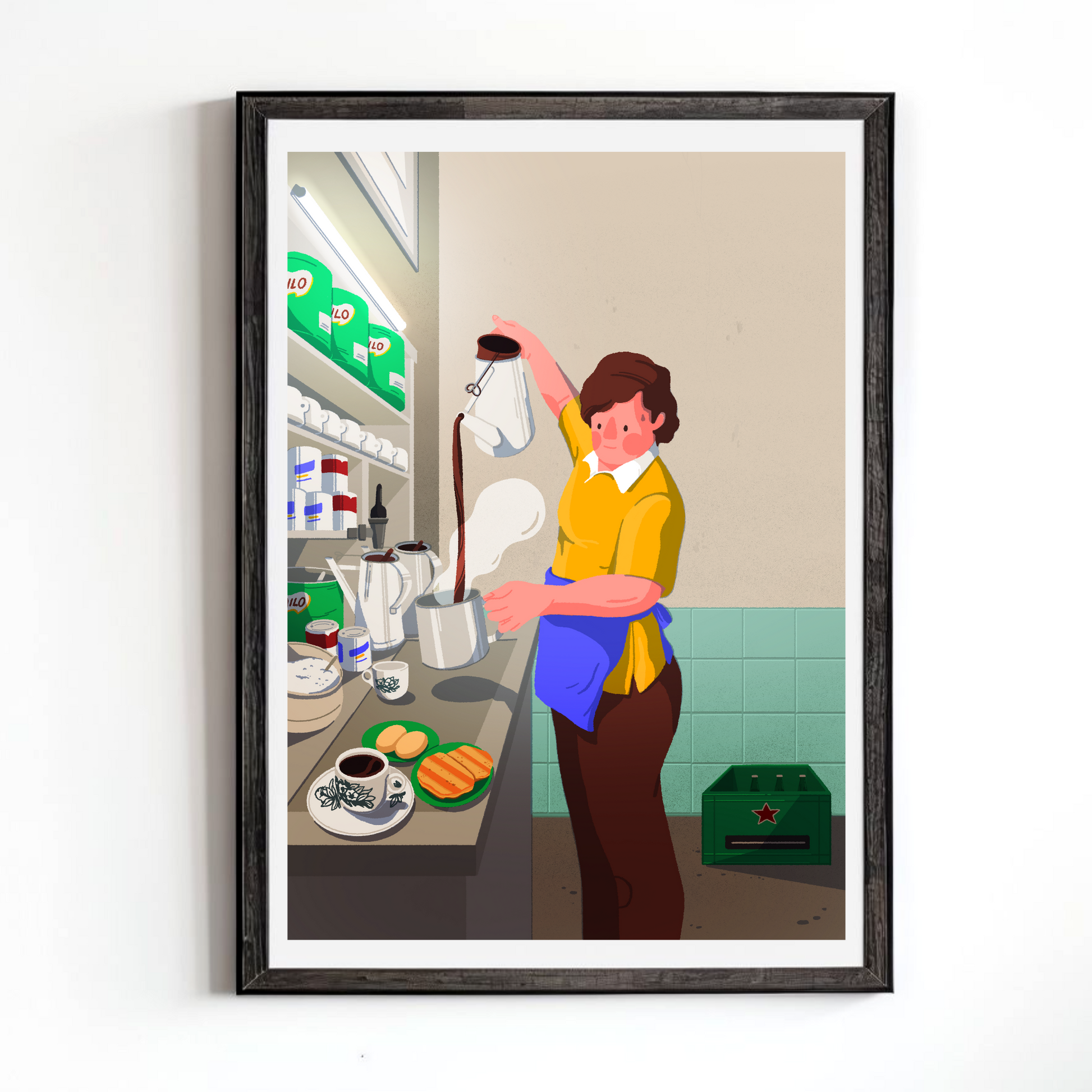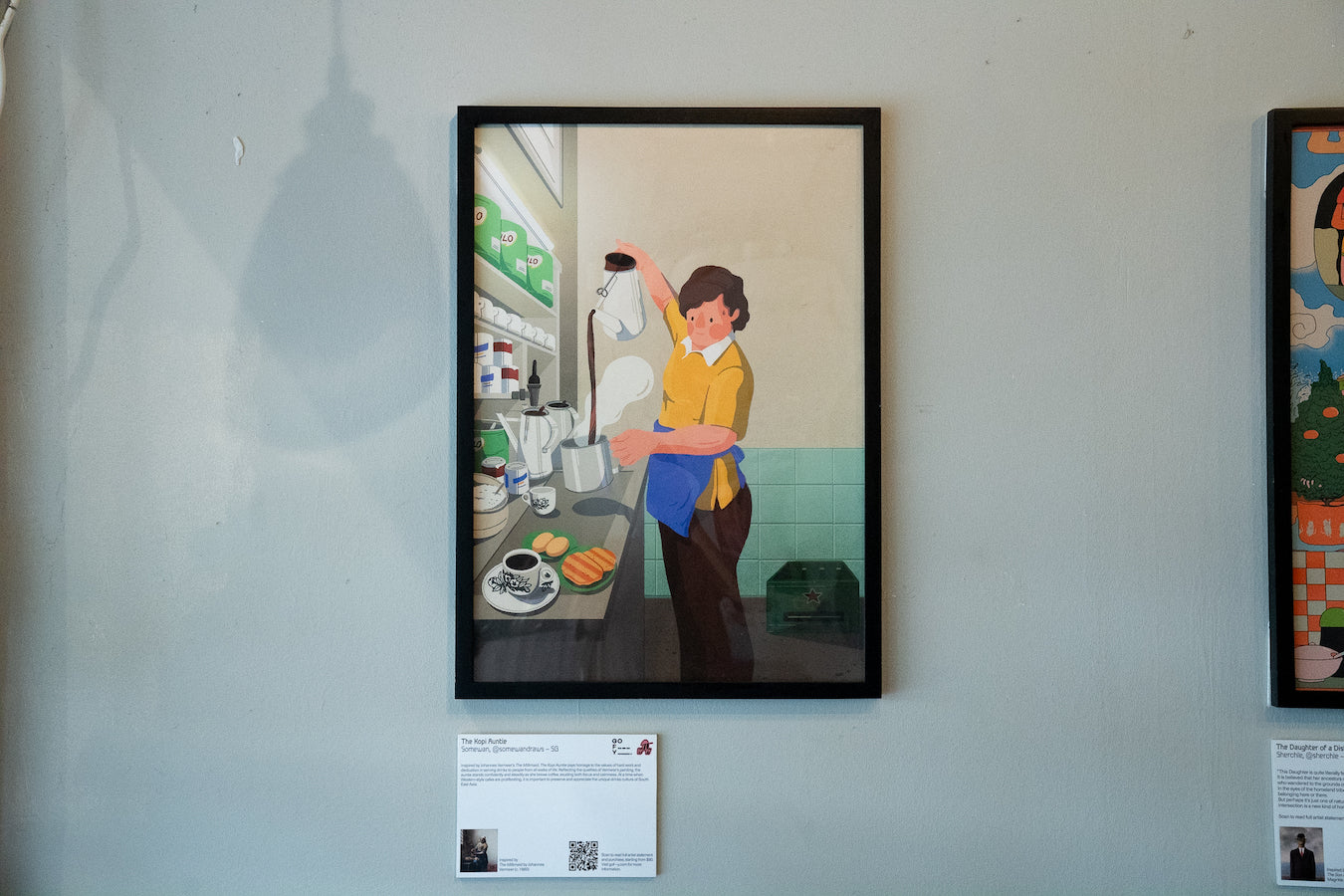 Inspired by Johannes Vermeer’s The Milkmaid, The Kopi Auntie pays homage to the values of hard work and dedication in serving drinks to people from all walks of life. Reflecting the qualities of Vermeer’s painting, the auntie stands confidently and steadily as she brews coffee, exuding both focus and calmness. At a time when Western-style cafes are proliferating, it is important to preserve and appreciate the unique drinks culture of South East Asia.