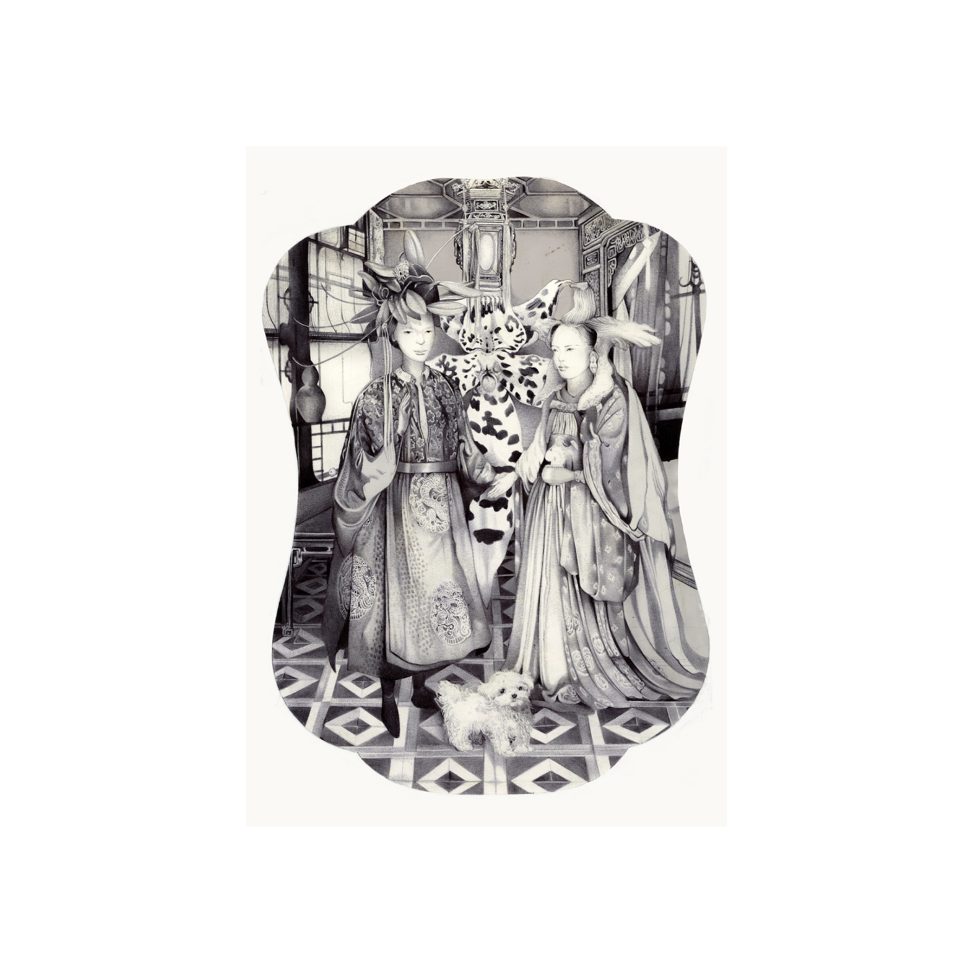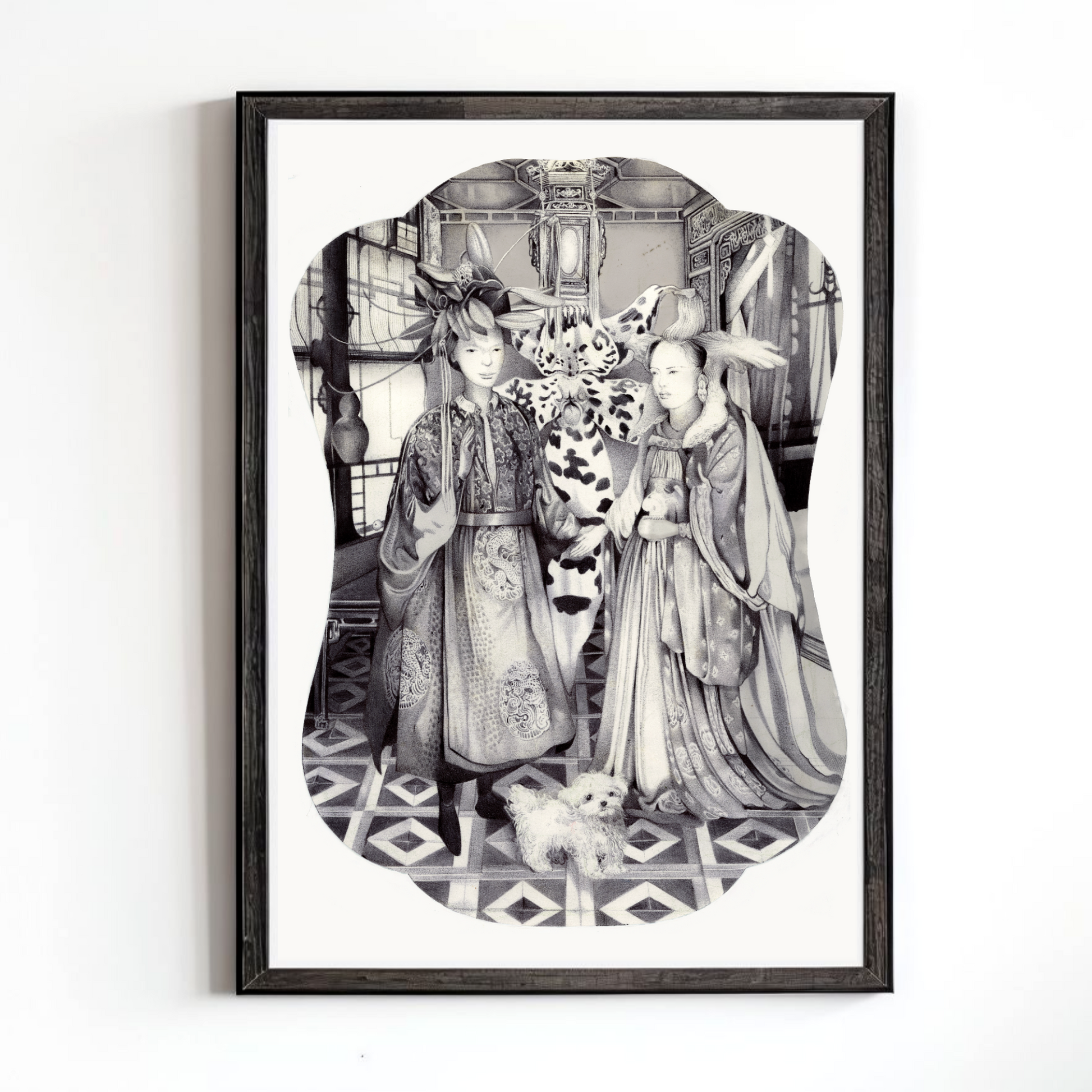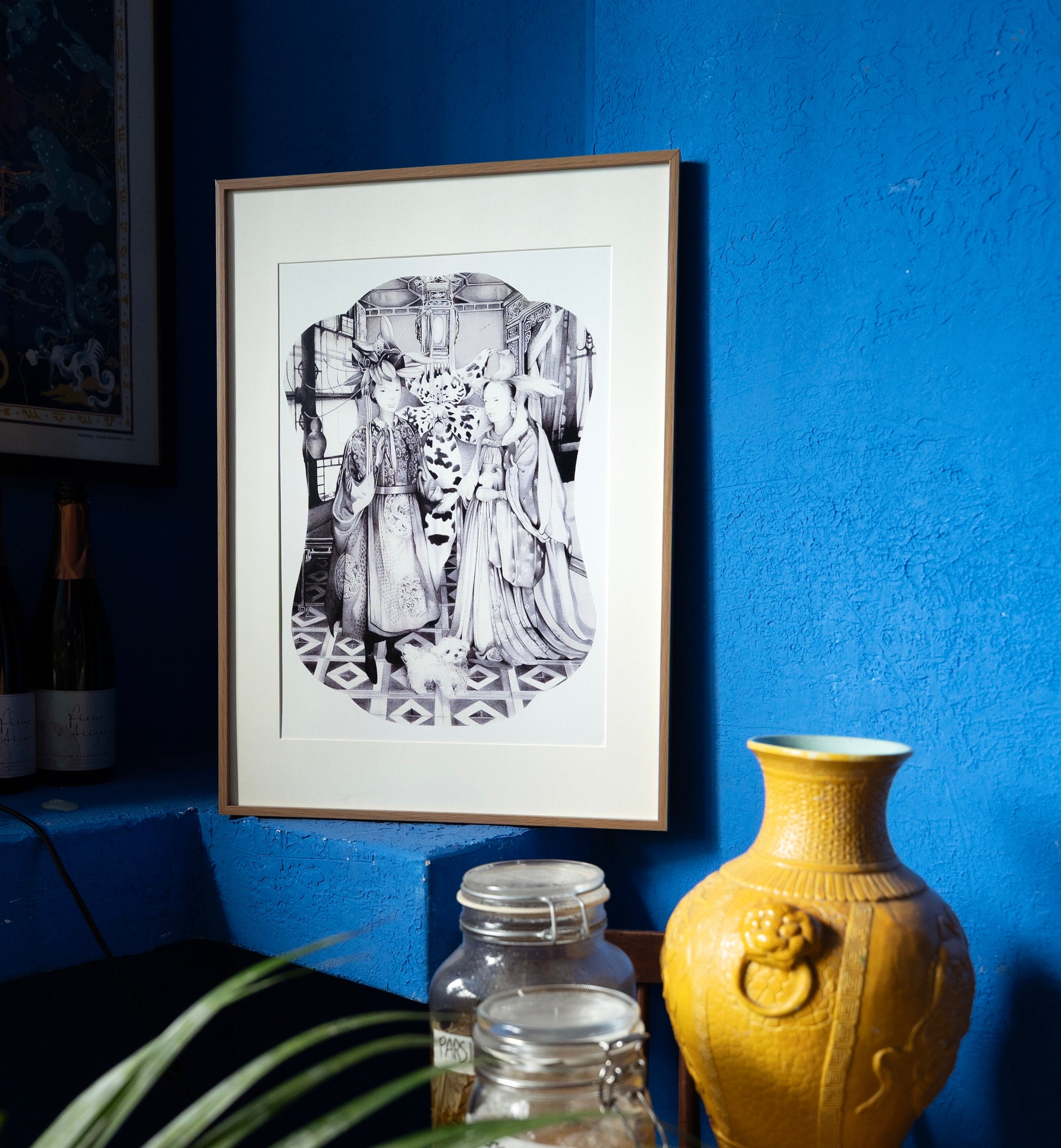 Jan van Eyck's The Arnolfini Portrait captures an intimate moment as a couple establish themselves in society. Despite its medieval origins, the painting echoes how modern couples blend heritage with their own desires and subvert societal norms. In Anna's ballpoint pen artwork, a Chinese tea ceremony symbolises unification; set amidst a surreal space adorned with orchids—a motif representing growth and transformation—that is wholeheartedly embraced and welcomed by the couple.