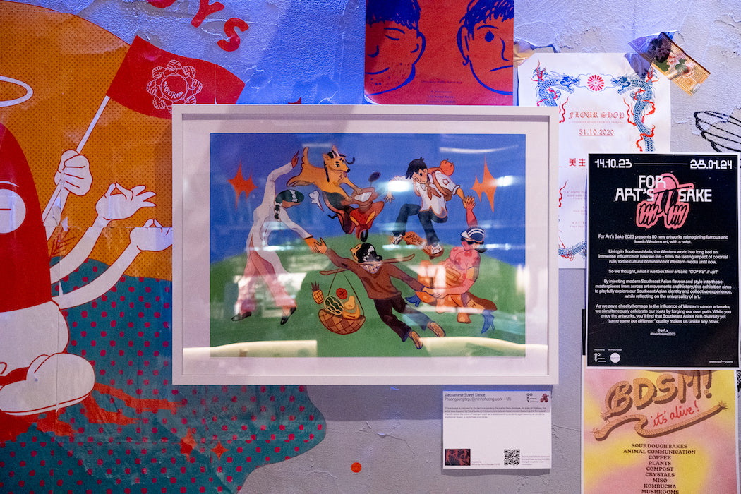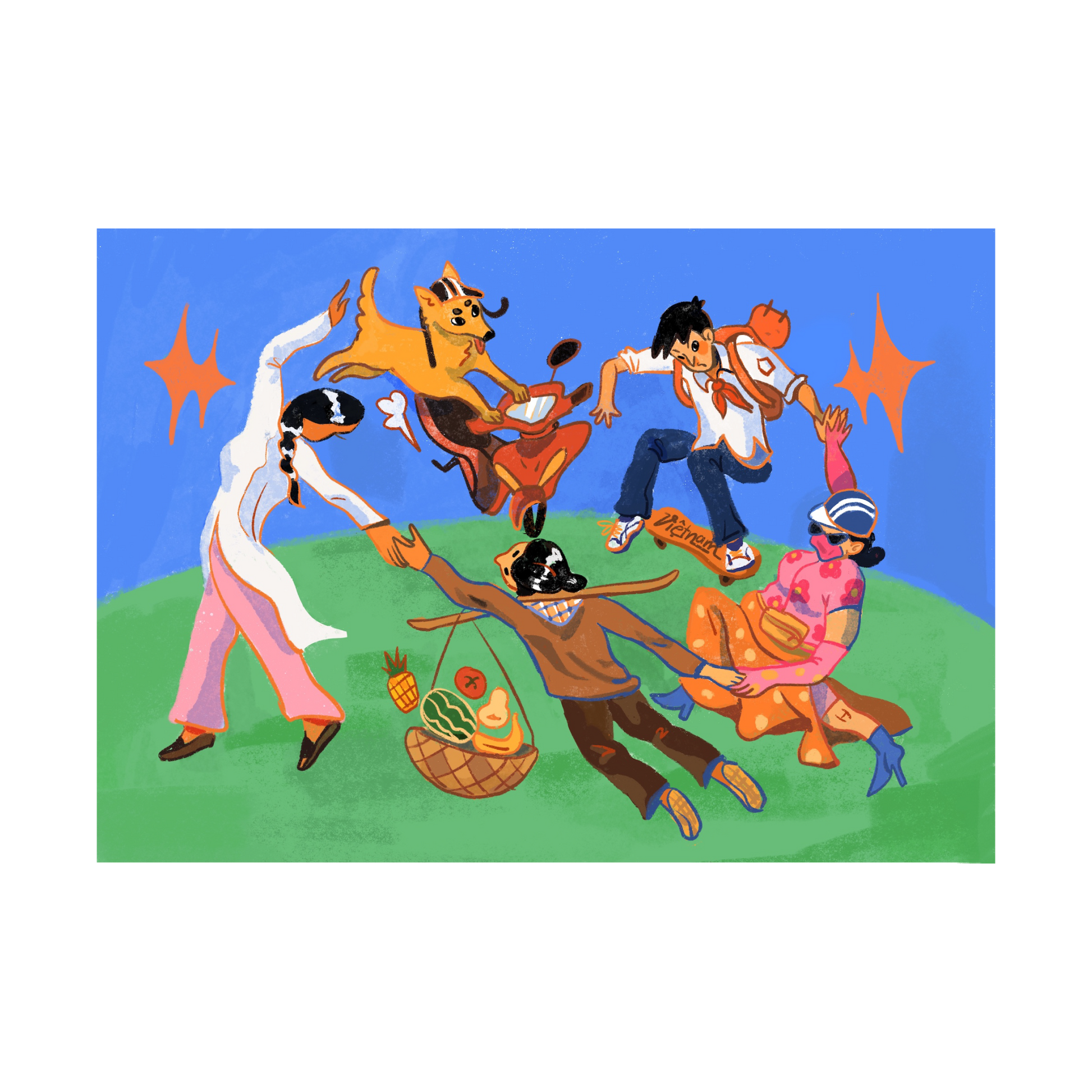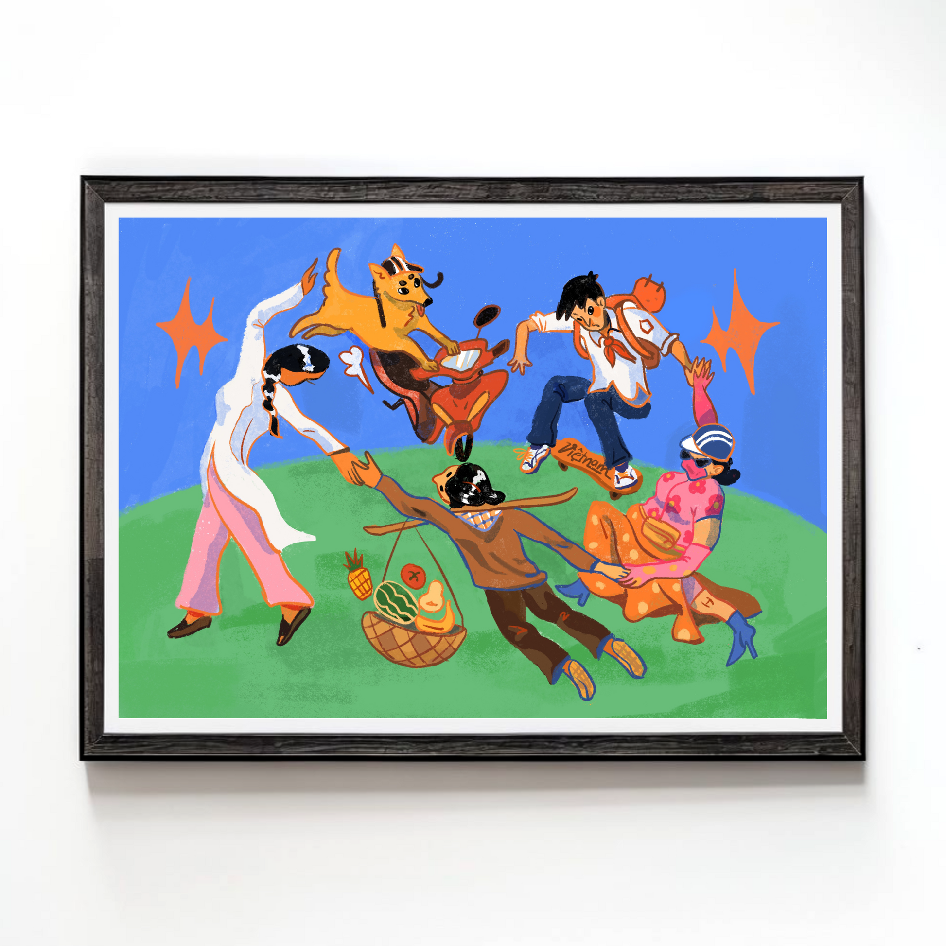 This artwork is inspired by the famous painting Dance by Henri Matisse. As a fan of Matisse, the artist was inspired by his shapes and colours to create an Asian version featuring the funny and friendly street life icons of Vietnam such as a skateboarding student, a girl wearing an áo dài (a traditional dress), a motorbike and more.