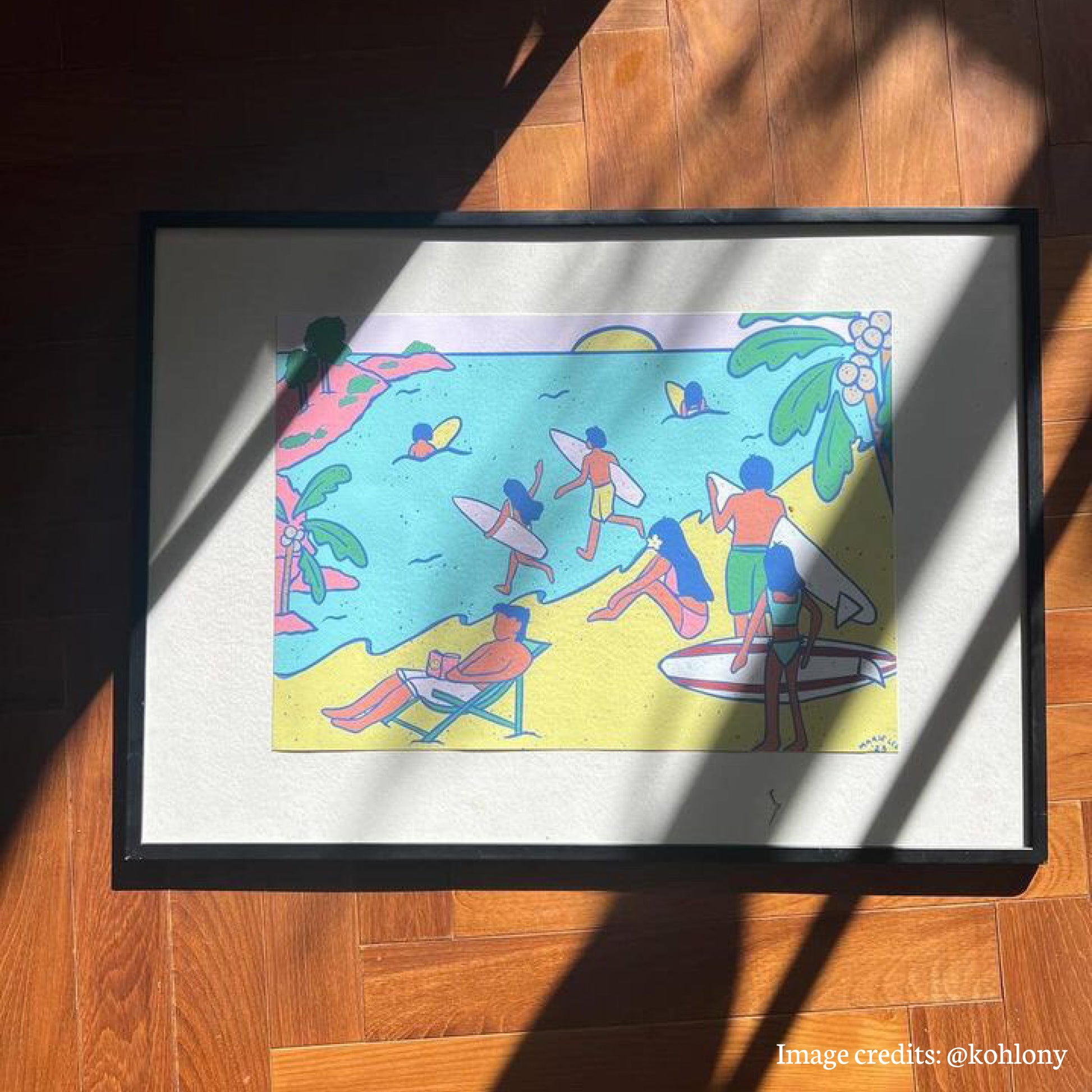 Drawing inspiration from Georges Seurat's A Sunday Afternoon on the Island of La Grande Jatte, Weekends on the Island transports the scene to a sun-drenched beach adorned with surfers eagerly awaiting the perfect wave. This reimagination not only pays tribute to the timeless appeal of Seurat's work, but also celebrates the artist's Filipino roots, where vibrant beach culture is a way of life. By infusing the iconic laid-back atmosphere in the original work with the familiarity of her homeland's shores, she invites viewers to bask in the harmonious blend of artistic influences and cultural experiences.