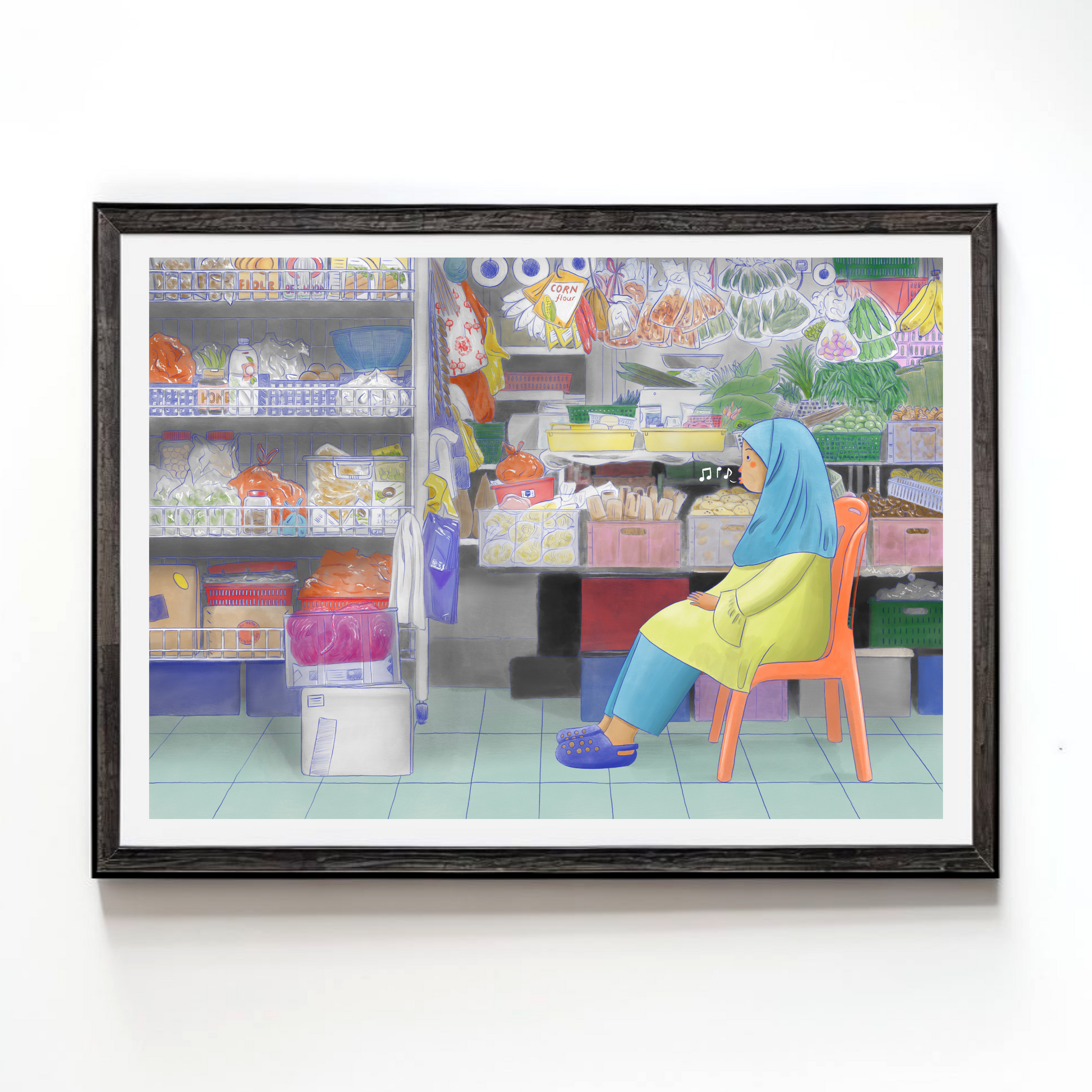 In Tess' interpretation of Whistler's Mother, the stall owner (the eponymous whistling mother) takes a brief respite amidst the chaos of the wet market. She is happy and content with how far she has come with her humble vegetable stall, and currently opens it just to pass her time. Her wish is that future generations will continue to appreciate the wet market and never let it disappear from Singapore's cultural fabric.